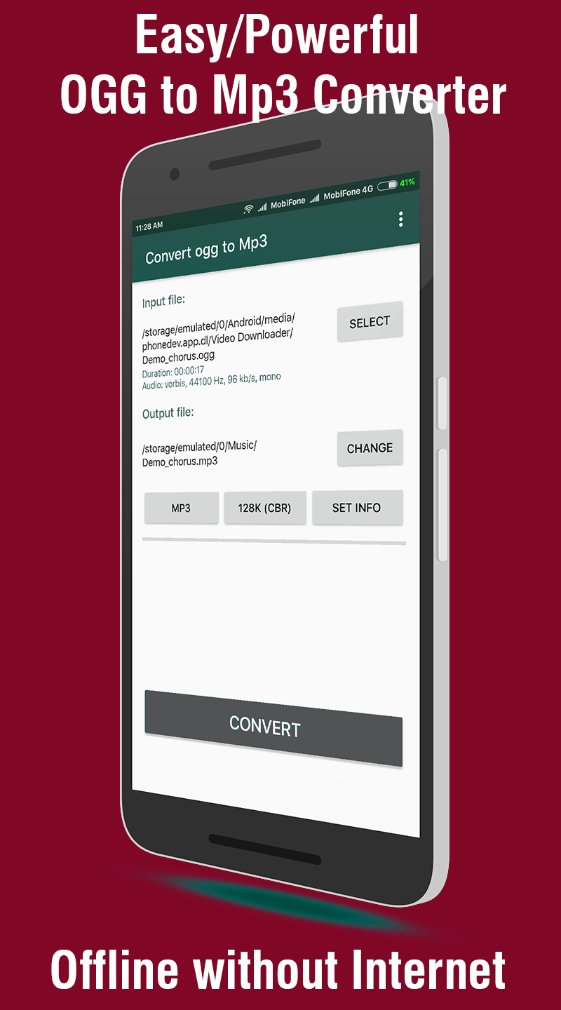 What is OGG? Ogg is a multimedia container format. The actual audio or video encoded by a codec is stored inside an Ogg container, and the native file and stream format for the Xiph.org multimedia codecs. The Ogg container format can multiplex a number of independent streams for audio, video, text (such as subtitles), and metadata. For example, a video file with sound contains data encoded by both an audio codec and a video codec. Because of its early entry into the file sharing world, MP3 became immensely popular. Its popularity is marked by the fact that the term MP3 was synonymous with Compressed audio. Some people use the term MP3 to mean any audio file. Ogg Vorbis is steadily gaining ground among developers because of its superior sound quality and open source code base. Notably, toy and hardware manufacturers are using Ogg Vorbis to encode their audio files to achieve efficient compression and avoid patent issues with MP3. However, the vast majority of portable music players (commonly referred to as "MP3 players" by many people) still do not support the Ogg Vorbis format. OGG MP3 Converter remains one of the most easy-to–use app ever existed. It can easily convert ogg audio to mp3, suitable for home users and company users to convert. What's more, this Free OGG to MP3 Converter not only offers an easy way to convert all your OGG audio files to MP3, but also to other audio formats including WAV, WMA, AAC, AIFF, M4A, AAC, etc. Also supports to convert video and audio files to vorbis ogg or mp3. Best way to convert OGG to MP3 file in seconds. 100% free, secure and easy to use! Do you want to convert a OGG file to a MP3 file ? This advanced offline app that solving any problems with any files. The best and the most effortless ogg to mp3 convertor app to convert OGG to MP3 or convert MP3 to OGG is to use OGG MP3 Converter. This OGG MP3 Converter is completely free of charge. Click the Download to try Free OGG to MP3 Converter. _____------=======How to convert OGG to MP3?=======------_____ Step 1. Select File: Use "Select" button to select the file you want to convert(you can select file from phone or Google Drive, Dropbox,....) in the pop-up dialog box. Step 2. Set Output Format: Click "Output Format" and choose MP3 Audio(*.mp3) or any file format are supported as WAV, WMA, AAC, AIFF, M4A, AAC from drop-down list according to your device. Step 3. Choose Destination. To set the folder that you want to save your target file (default is SDcard/Music folder)/ Step 4. Adjust Bitrate Setting, Edit Mp3 Tag support Album Artwork, Edit tag music. Step 5. Start the OGG to MP3 Conversion by click "CONVERT" _____------======= ENJOY!!! =======------_____