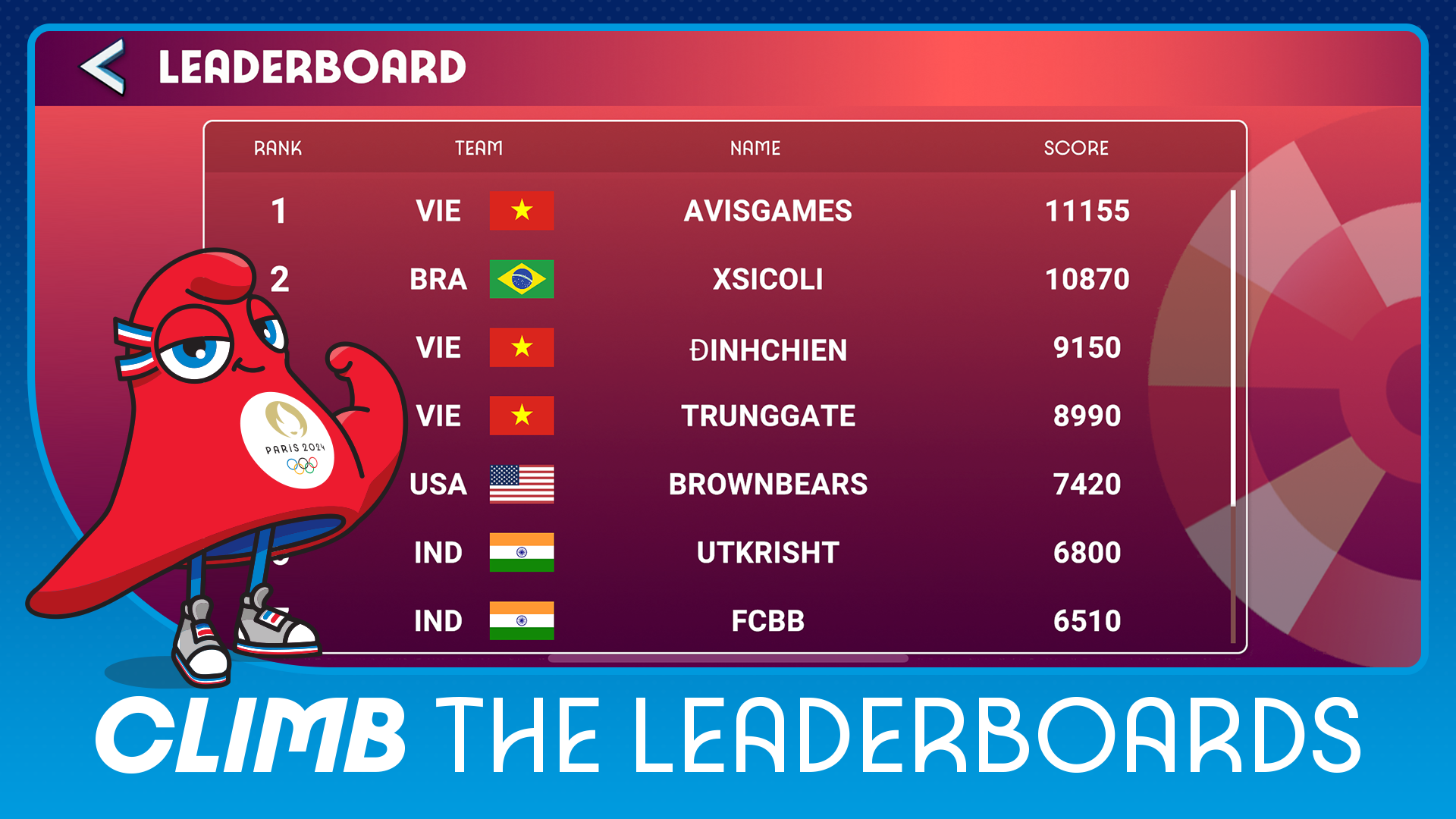- Added Personal Best to record your best results - Added Seasonal Leaderboards; resets weekly - Added Daily 1st Win Reward for each sport - Leaderboard points now based on a multiplier of stadium level - Increased fan points from buildings - All outfits can be unlocked through training - Added Setting to share Athlete Customization across sports - Added ability to rename and change your flag from Player Profile - Temporary Boosts can now be purchased with gems - Fixes and optimizations
