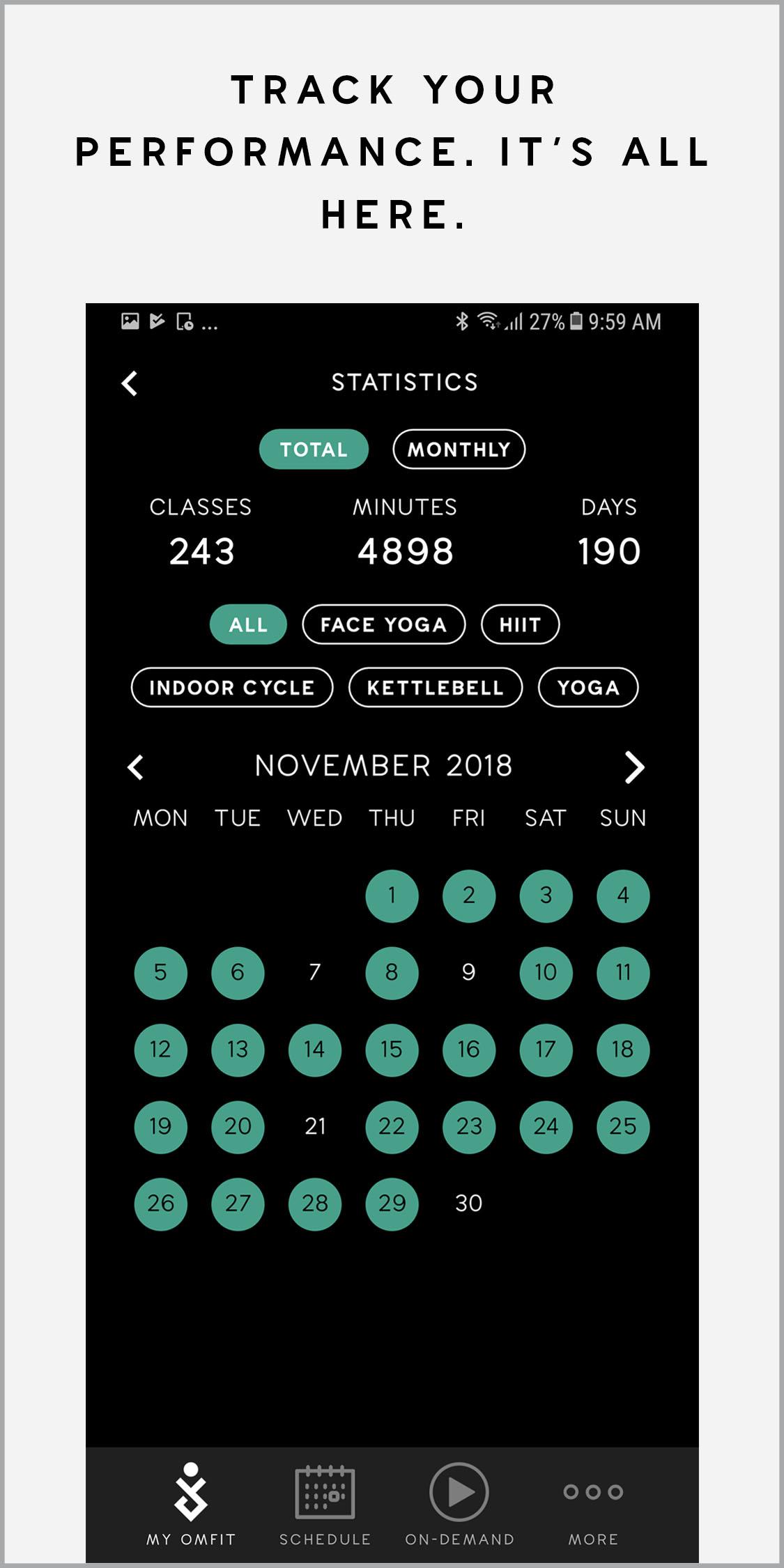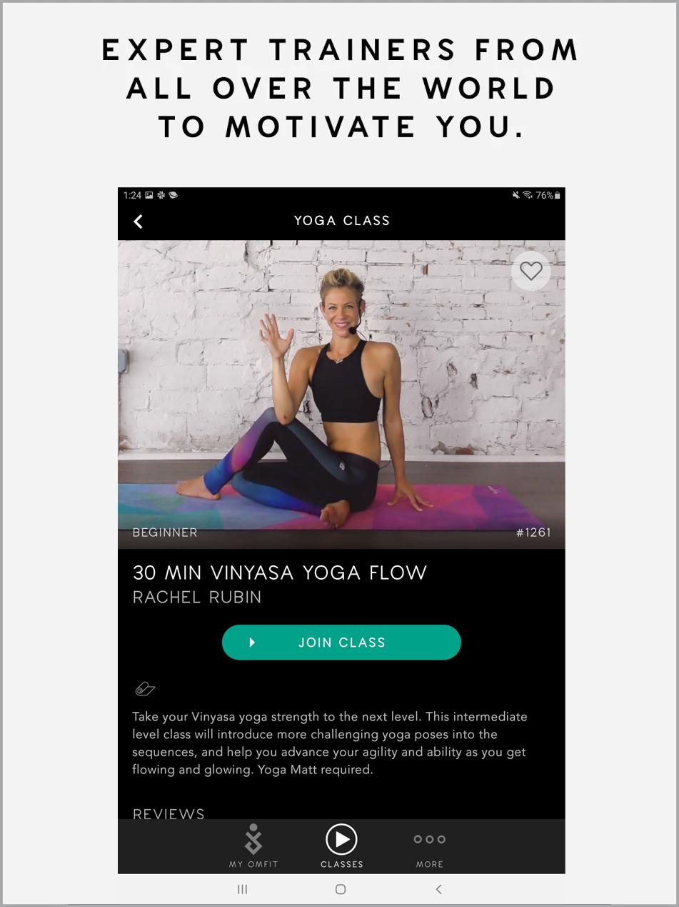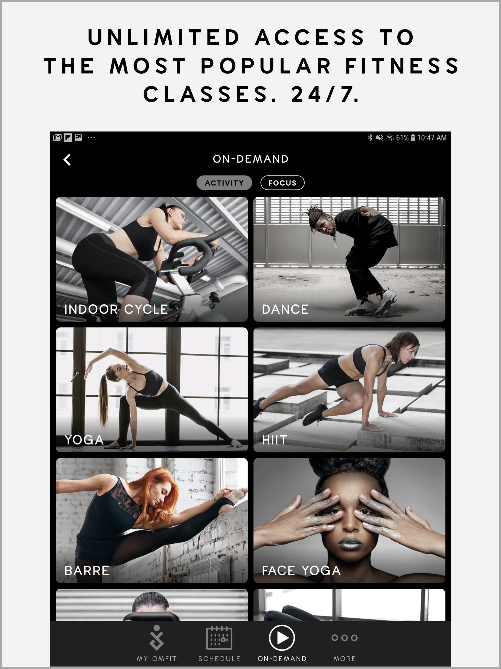 INSPIRING WORKOUTS. AMAZING RESULTS. - Movement and technology are combined to create a new fitness experience unlike any other. The best classes for every fitness level expertly lead by top trainers from around the world. INSTANT ACCESS TO THE MOST POPULAR FITNESS CLASSES FROM EVERY CORNER OF THE GLOBE, 24/7 - Exhilarating workouts include the class types below, with lots of great new classes added regularly. Alternatively, you can search by ‘Focus’ - the specific area of your body you want to focus on during your workout. • Yoga • HIIT • Cardio Dance • Stretching • Face Yoga • Barre • Indoor Cycle • Pilates • Kettlebell • Trampoline • Cardio Hip Hop EXPERT TRAINERS FROM ALL OVER THE WORLD TO MOTIVATE YOU - Whether you’re a curious beginner or a fitness fanatic, we’ve got you covered. TAKE YOUR PICK FROM 5, 10, 20, 30, OR 45-MINUTE CLASSES - There’s something for every fitness ability, mood, energy level, and busy schedule. BRAND NEW CLASSES ADDED ALL THE TIME - Always something new to try and discover! PERSONAL TRAINING – WHEREVER, WHENEVER - Wherever life takes you, you’ll have instant access to a huge range of customized fitness classes in the palm of your hand, 24/7. OMFIT MEMBERSHIP ACCESS PLANS TRY IT FREE - Get 14 days of free, unlimited access to OMFIT and experience Fitness for yourself, with our compliments. MONTHLY PLAN ($14.99/Month) - After your 14 day free trial expires, you will be billed $14.99/month for unlimited access to the best fitness experience available on your Android device.