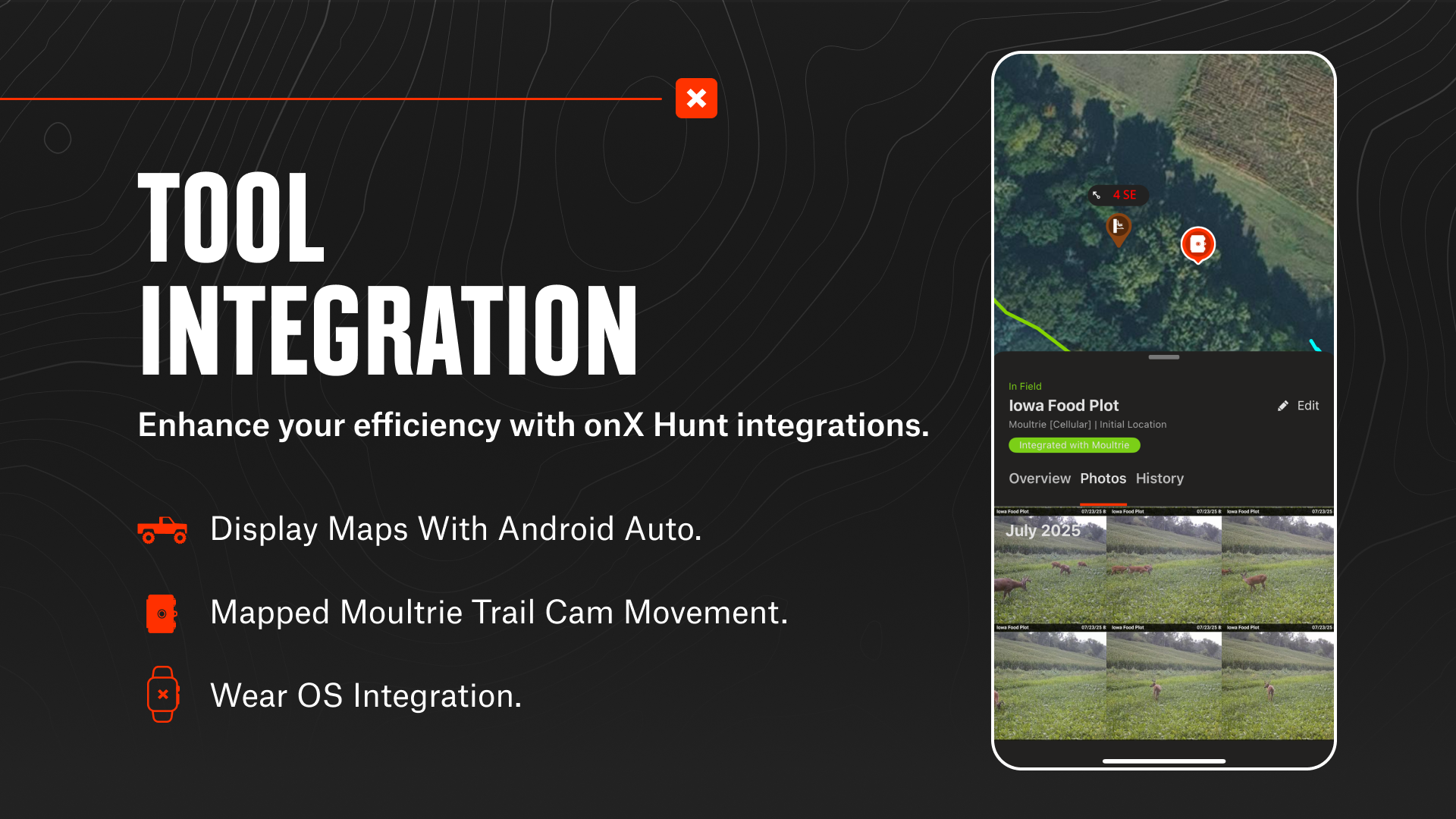 Integrate onX Hunt with compatible tools. View Trail Cameras for recent activity, display routes on your vehicle dash, and sync industry-leading rangefinders and binoculars with the App. Share Map Markups with nearby devices on the same platform and keep your hunt safe, organized, and efficient.