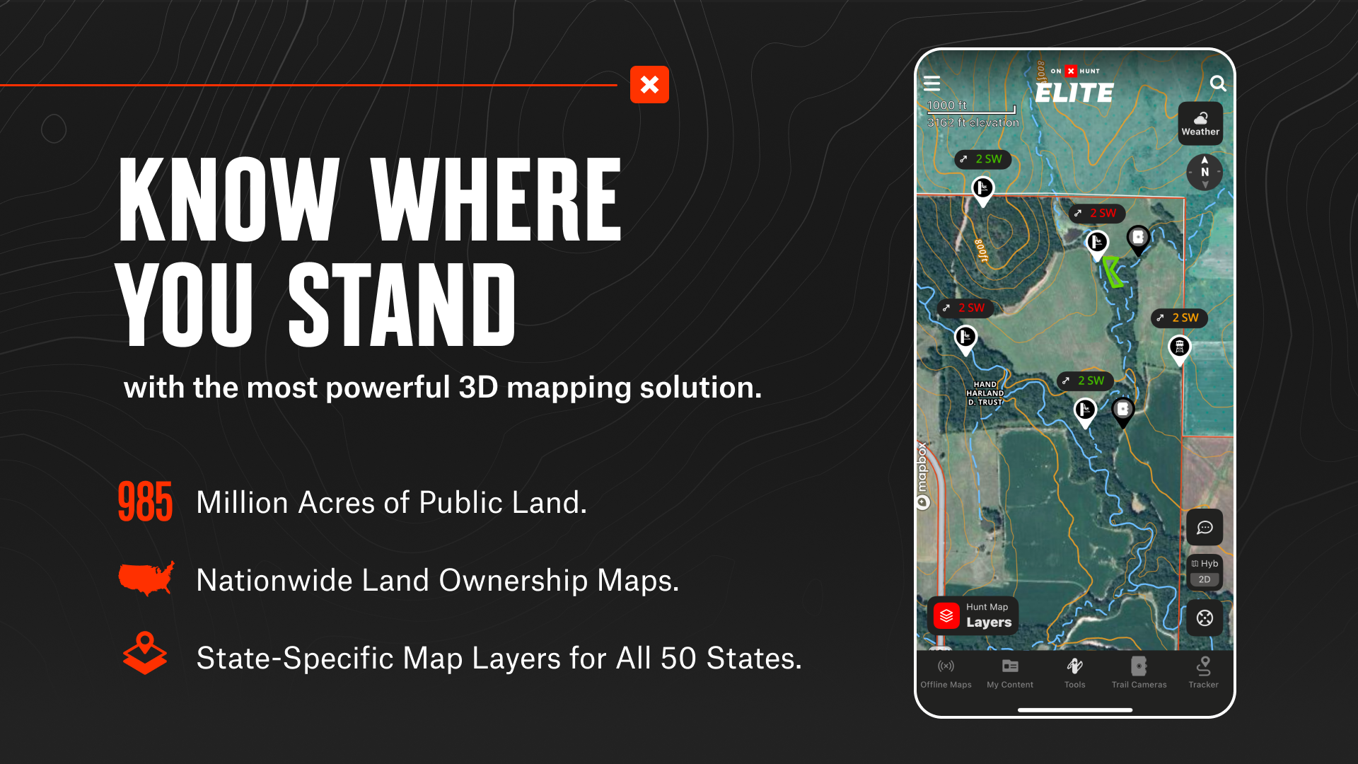 Navigate your next hunt and find more success in the field with onX Hunt. Access GPS navigation, 3D maps, species data, hunting units, and more. Whether you’re a private or public land hunter, know where you stand with nationwide land boundaries.