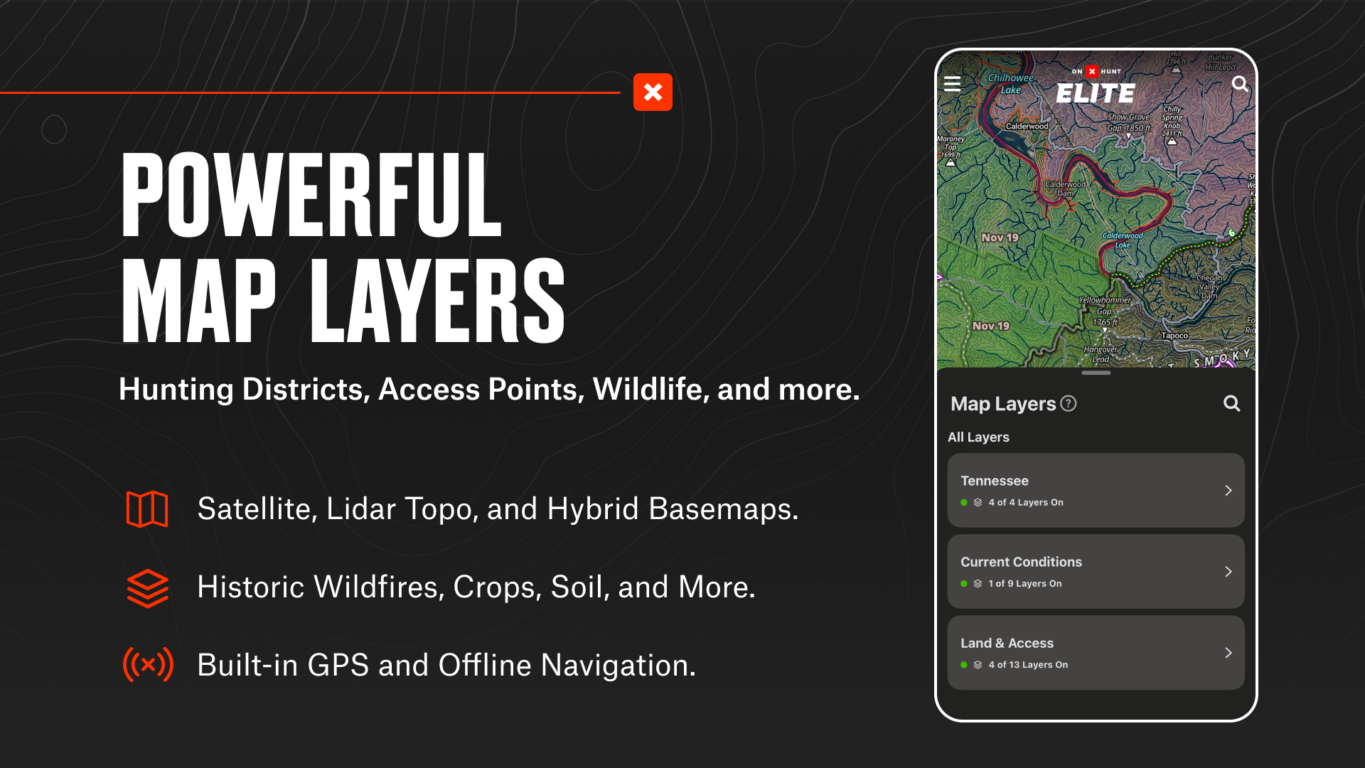 Utilize Lidar Topo, Satellite, or Hybrid Basemaps to understand the landscape. Save Offline Maps, view terrain, and mark crucial locations with Waypoints. Research property lines, monitor optimal weather conditions, and find new opportunities nationwide with custom Map Layers.