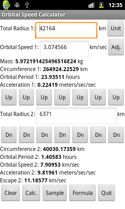 You input a known orbit into this program. It will then calculate the mass of the body being orbited. You then input a new altitude in terms of radius and it will calculate the speed required to be in orbit, as well as escape velocity at that distance. This program calculates an orbital speed based upon a known orbit. Upon startup, this program uses the altitude for a Geostationary orbit which is 42164 kilometers and speed of 3.074566 km/sec. The given value from Wikipedia is 3.0746 km/sec. The default secondary altitude is 6371 km which is the average radius from the center of the Earth at the surface. This program uses the Pythagoras theorem to calculate the gravity at the surface of the Earth as 32.21656 feet per second per second. a is the distance object 1 travels in one second. c-b is the distance object 1 falls in one second. The Total Radius 1 and Orbital Speed 1 must be very precise to compute mass as the same as found on the internet. Assuming a Geostationary orbit is exactly 42164 km with a speed of 3.074566 km/sec, I adjusted the gravitational constant to .00000000006673839 instead of .00000000006673840 to compute the mass of the Earth as 5.97219E24kg. 5.97219E24kg is the value I found on Wikipedia. Starting with Earth orbit circumference of 940,000,000 km, you can input 149605646.5 as Total Radius 1, 29.783945 as Orbital Speed 1 to come up with 1.9885508E30 as the mass of the Sun. If the nice round number of 30 km/sec is more correct then the circumference is wrong. Assuming an exact LRO radius of 1788 (50 km above the Moon) and an LRO speed of 1.6560712523 we get the known mass of the Moon. I used a Total Radius 2 for Mars as 228924066 to come up with the known orbital speed of 24.077 km/sec Notice that the acceleration or gravity on the surface of the moon of 5.32612 ft/sec/sec is almost exactly 1/6th that of the Earth (32.21656 ft/sec/sec) Since distance equals 1/2 gravity times time squared, an object falling exactly 16 feet in one second equals a gravity or acceleration of 32 feet per second per second. Also see "Calculus for Dummies" page 86 to see how an object falling 16 feet in one second computes to an acceleration of 32 ft/sec/sec. The program uses the formulas: a squared plus b squared equals c squared, acceleration equals (c minus b) times 2, velocity equals the square root of mass times the gravitational constant over radius and to compute mass we use - a squared times b over the gravitational constant. You can input a Radius less than the surface of the Earth or other body, but the data will be incorrect, obviously because there is mass above the orbiting object which this program does not calculate. You can download the source code for App Inventor from my website.