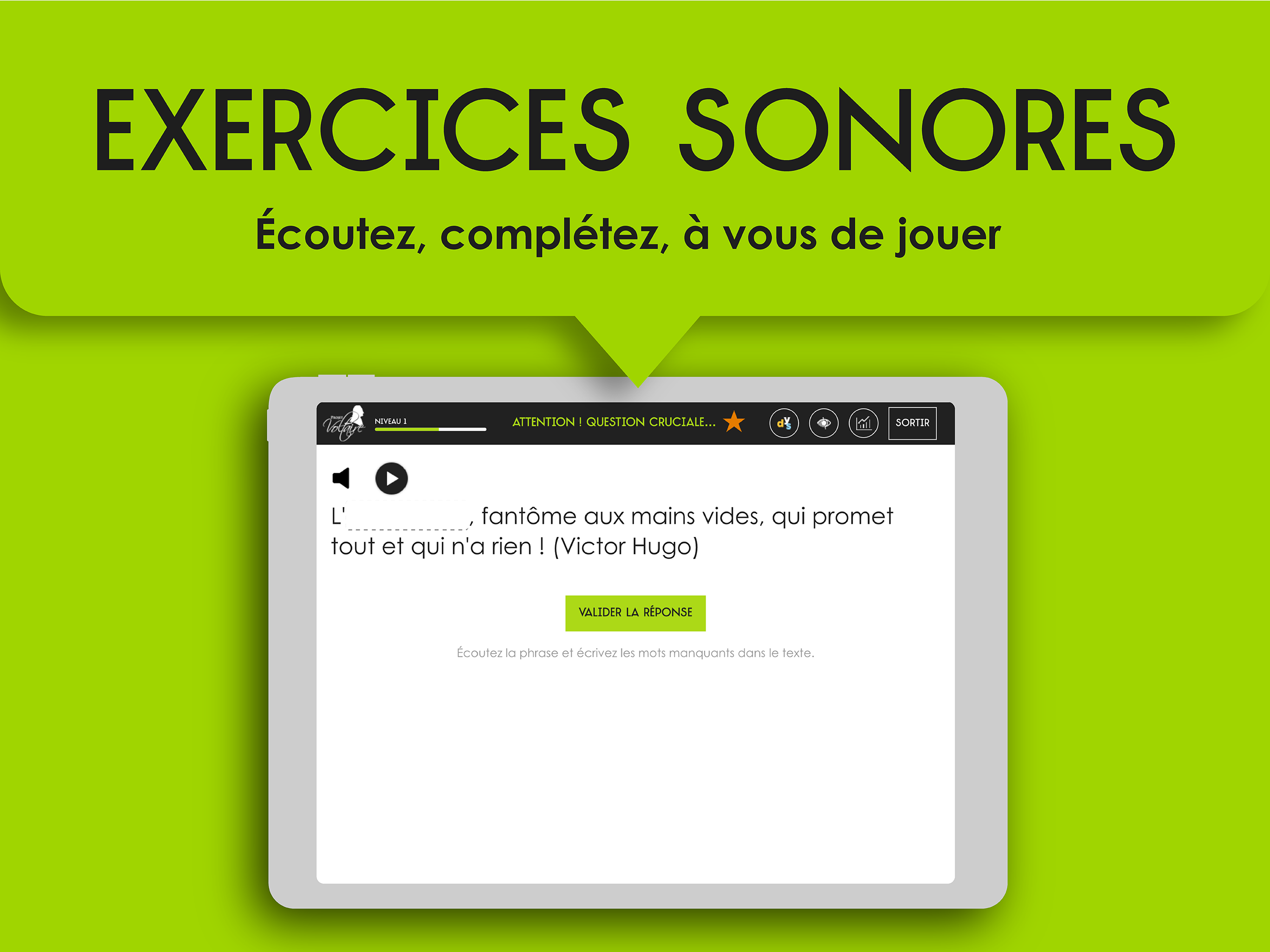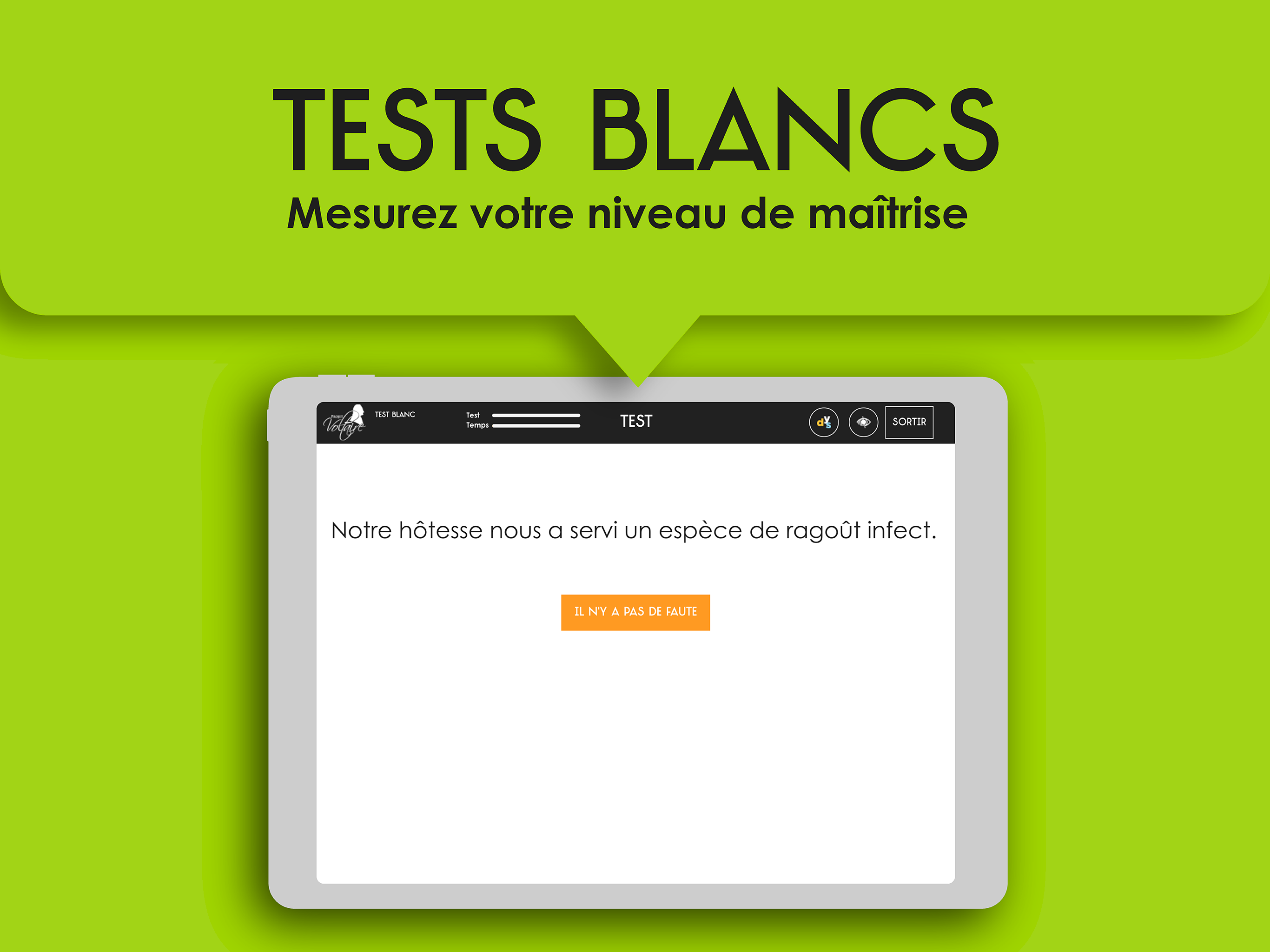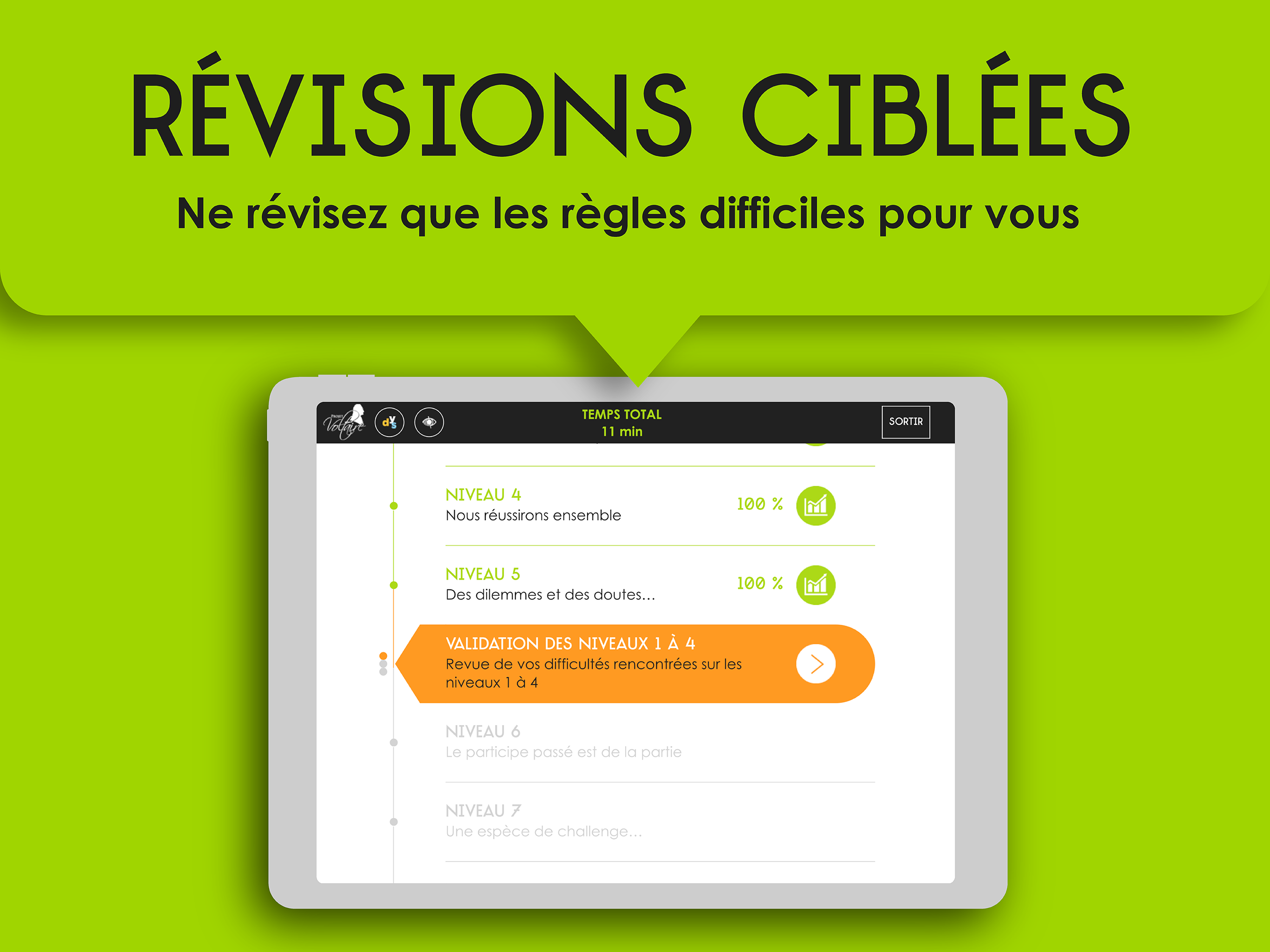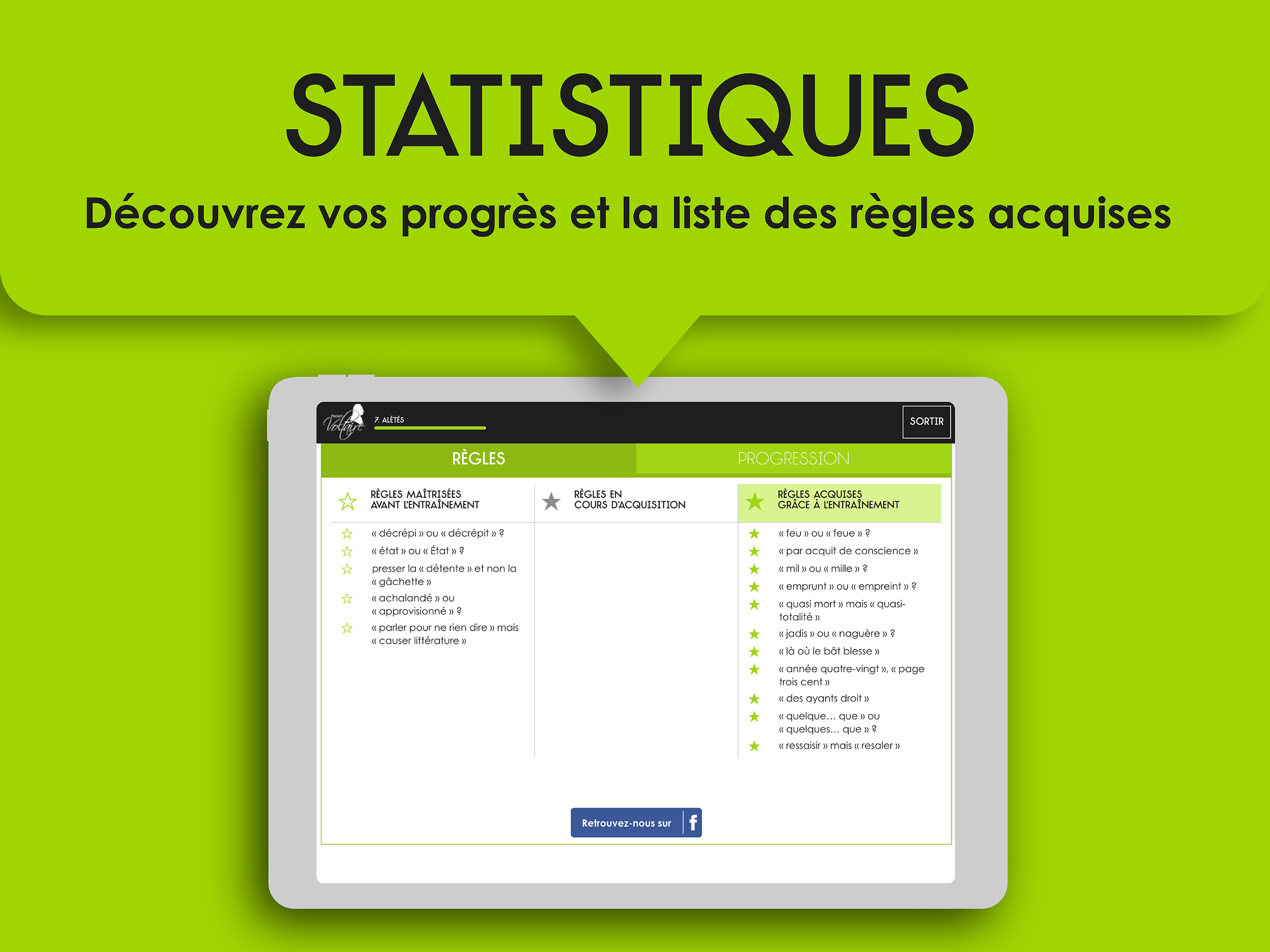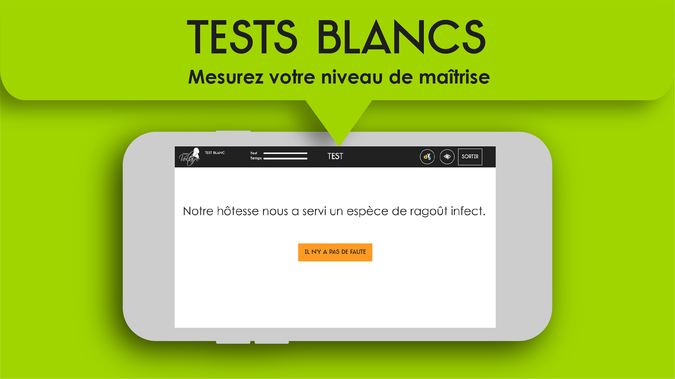 Angry with spelling or passionate about the French language? Like you, 7 million people have already chosen the Voltaire Project, the No. 1 spelling refresher, used by 4,000 schools and 1,200 companies. From 8 to 99 years old, whatever your level, this fun and terribly effective app will surely reconcile you with spelling. Progress is lasting and guaranteed thanks to its ultra-personalized training and refresher method, the only one that adapts in real time to your shortcomings and your memorization pace. This method is based on the Ancrage Mémoriel® engine and its effectiveness has been scientifically proven. Click on the mistake, square of choice, sound exercises... the Voltaire Project offers simulation exercises that allow you to detect mistakes, but also to write a word correctly with the correct spelling, the correct agreement, the correct conjugation . Progress from level to level and master the essential rules to be comfortable in any situation. Access your learning statistics at any time and discover your progress! Once your training is over, why not take the Voltaire Certificate? An asset on your CV to make a difference with recruiters and testify to your competence. With 1,800 approved examination centers, do not deprive yourself of this certification already passed by 200,000 people! 01Net: "Project Voltaire is the best tool for those who wish to make serious progress in spelling" (August 2019) TF1: "A large-scale application that reconciles the French with spelling" (Journal de 20 heures, May 2, 2019) M6: "The Voltaire Project is a huge success, with 5 million users" (Le 19.45, 22 mars 2019) France Inter: “The Voltaire Project, an app to fill spelling gaps” (March 4, 2019) Elected "best e-learning service in Europe across all disciplines" by EFFEP (European foundation for e-learning projects). Richelieu Senghor Prize for his exceptional contribution to the influence of the French language in the world. General conditions of use: https://www.projet-voltaire.fr/mentions-legales/ Twitter: https://twitter.com/Projet_Voltaire Facebook: https://www.facebook.com/Projet.Voltaire/
