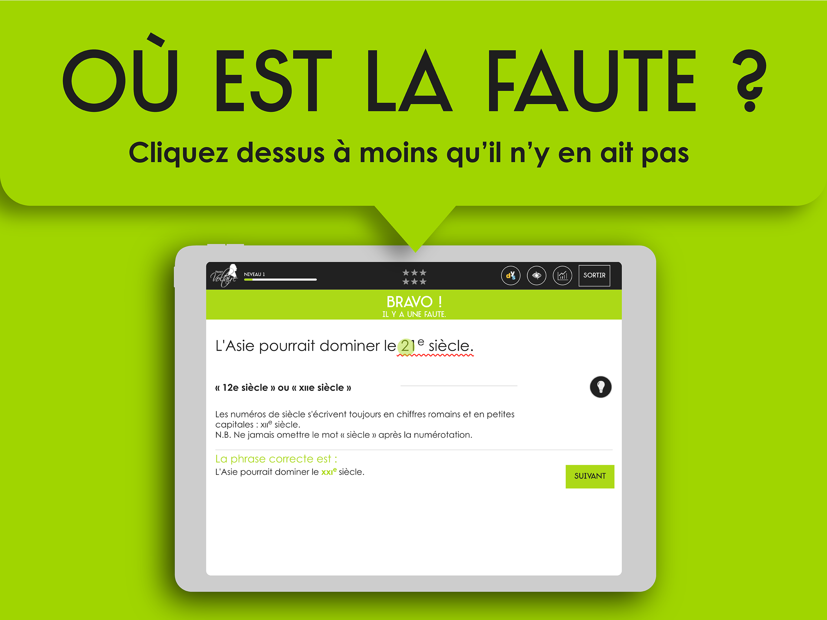 Votre appli de remise à niveau en orthographe a fait une cure de jouvence cet été et propose de nombreux contenus et fonctionnalités : * De nouveaux types d'exercices, comme les dictées sonores * Plus de niveaux, plus de règles * Des astuces, de nouveaux contenus, près de 300 vidéos d’explication * Votre appli et vos révisions accessibles sans supplément sur projet-voltaire.fr pendant 1 an Votre avis compte ! N'hésitez pas à nous laisser une note avec votre commentaire.