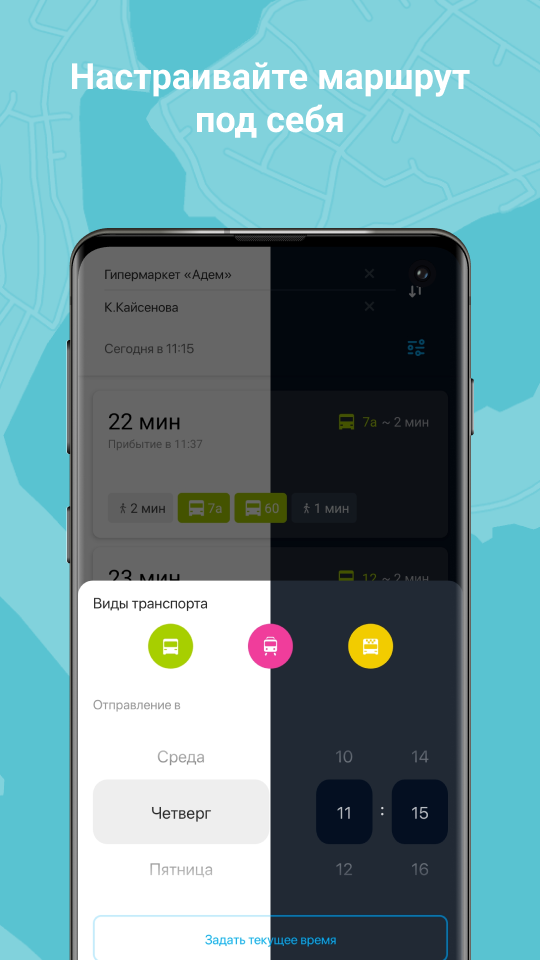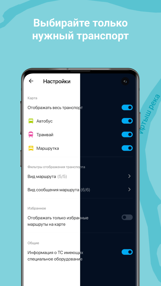 Settings Want to see only certain modes of transport on the map? Choose the ones you need in the Settings. Also, in Settings, you can enable the display of only important routes that are added to Favorites. Customize the application as convenient as possible.