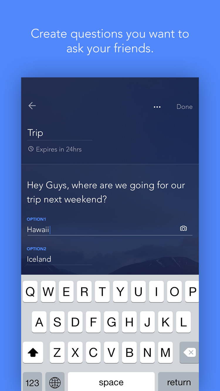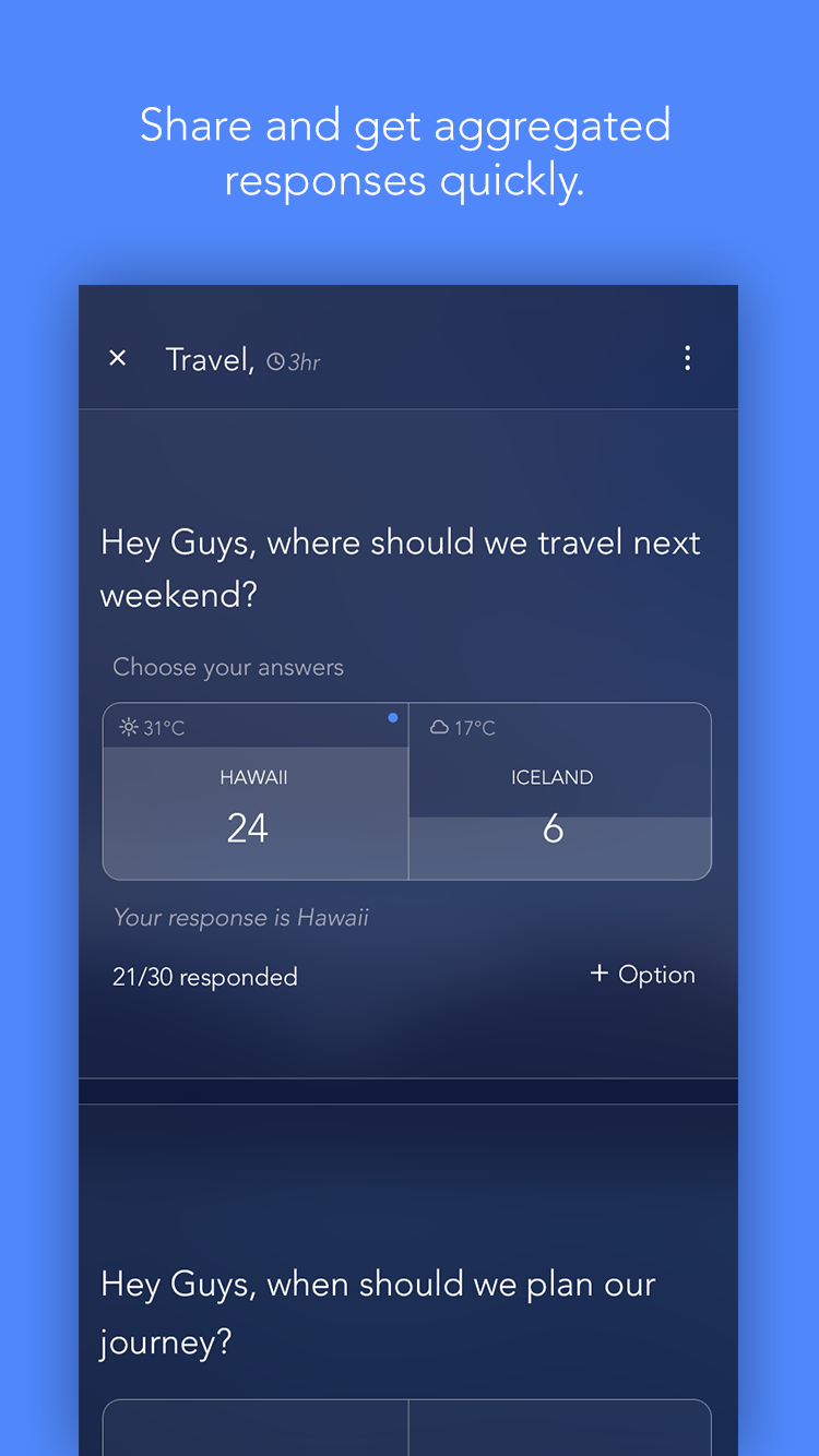 Owlie makes it a breeze asking questions, polls, and opinions from your friends; then getting definitive answers right away.