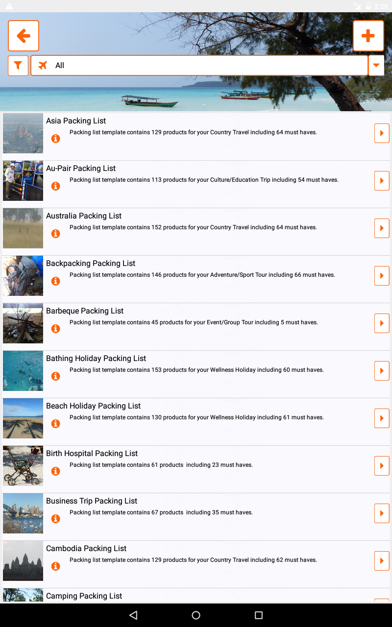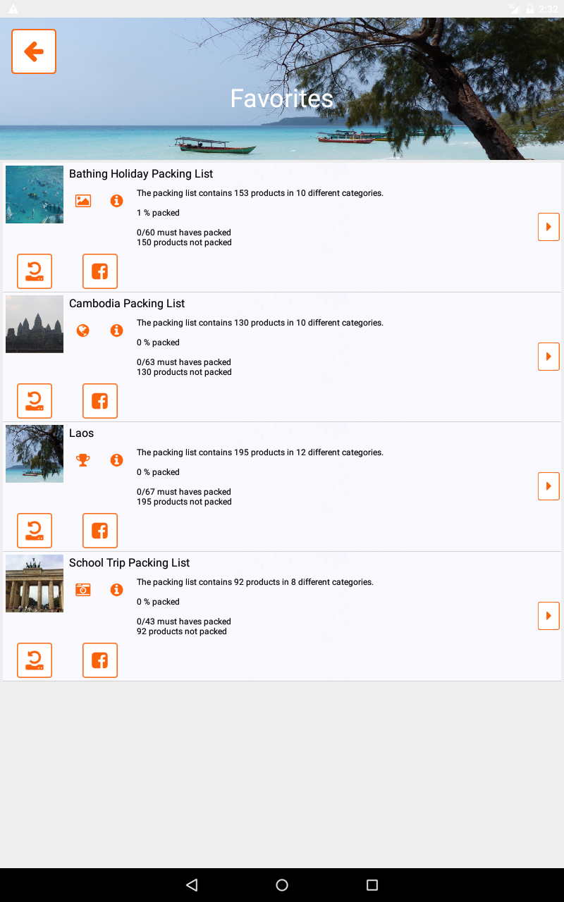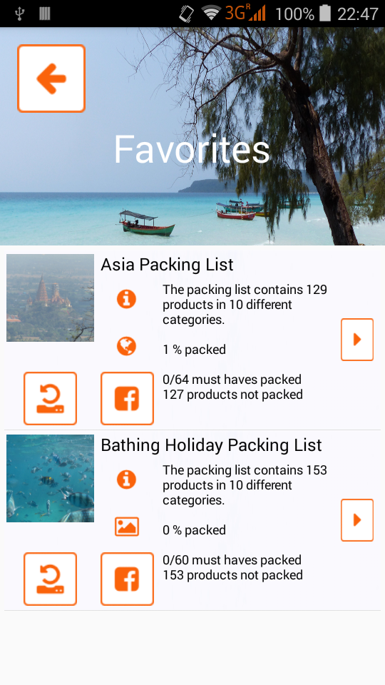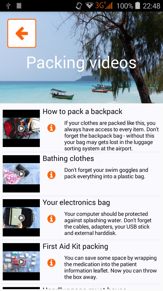 pack list app for different types of holiday like adventure/sport trips or wellness holidays, different activities like mountain biking, hiking or paragliding and different destinations all over the world.