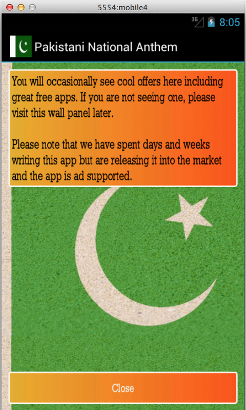 Our Support Website: http://www.icodejava.com/android-app/106/pakistani-national-anthem-smartphone-application/ "Pakistani National Anthem" android app lets you play the patriotic national anthem "Pak Shar Zameen Shadbad" of islamic country Pakistan in your android based cell phones. This is developed by professionals at Sanjaal Corps. The flags of Pakistan and the national anthem music are used under "fair usage" policy and Sanjaal Corps neither has the right to the flag, nor to the lyrics, audio and the musical notations. Pakistani National Anthem Info: The Qaumi Tarana is the National Anthem of Pakistan. The words "Qaumi Tarana" in Urdu literally translate to "National Anthem". The Pakistani national anthem is unique in that its music preceded its lyrics, which are in Persian. At independence, on August 14, 1947, Pakistan had a different national anthem written by Prof. Jagannath Azad, who had been asked by the Quaid, Mr. Mohammed Ali Jinnah, to write the very first national anthem of Pakistan. Prof. Azad’s aa sarzameen paak was, in fact, Pakistan’s first national anthem, until it was later replaced by the current anthem. The flag itself had only been approved by the Constituent Assembly of Pakistan three days earlier.The current national anthem of Pakistan was written by a Muslim writer named Abu-Al-Asar Hafeez Jullundhri. In early 1948, A. R. Ghani from Transvaal, South Africa, offered two prizes of five thousand rupees each for the poet and composer of a new national anthem. The prizes were announced through a Government press note published in June 1948. In December 1948, a National Anthem Committee (NAC) was formed, initially chaired by the Information Secretary, Sheikh Muhammad Ikram. Committee members included several politicians, poets and musicians such as Abdur Rab Nishtar, Ahmed Chagla and Hafeez Jullundhri. The committee had some difficulty at first in finding suitable music and lyrics. In 1950, the impending state visit of the Shah of Iran resulted in the Government asking the NAC to submit an anthem without delay. The committee chairman, Federal Minister for Education, Fazlur Rahman, asked several poets and composers to write lyrics but none of the submitted works were deemed suitable. The NAC also examined several different tunes and eventually selected the one presented by Chagla and submitted it for formal approval. Chagla produced the musical composition in collaboration with another committee member and assisted by the Pakistan Navy band. The music of the anthem was composed by Ahmed Ghulamali Chagla, with lyrics written by Abu-Al-Asar Hafeez Jullundhri. The three stanza composition was officially adopted in 1954. However, the music for the anthem had been composed in 1950 and had been used on several occasions before official adoption. The composition is unique in a way that no part of the anthem repeats itself. The lyrics allude to a "Sacred Land" referring to Pakistan and a "Flag of the Crescent and Star" referring to the national flag. Unofficially, the anthem is sometimes referred to by its first line "Pak sarzamin shad bad" (Urdu: "Blessed be the sacred land"). The national anthem is played during any event involving the hoisting of the flag. The anthem without lyrics was performed for Prime Minister Liaquat Ali Khan and later for the National Anthem Committee on August 10, 1950. Although it was approved for playing during the visit of the Shah, official recognition was not given until August 1954.[5] The anthem was also played during the Prime Minister's visit to the United States. The NAC distributed records of the composed tune amongst prominent poets, who responded by writing and submitting several hundred songs for evaluation by the NAC. Eventually, the lyrics written by Jullundhri were approved and the new national anthem was first played properly on Radio Pakistan on August 13, 1954. Official approval was announced by the Ministry of Information and Broadcasting on August 16, 1954.