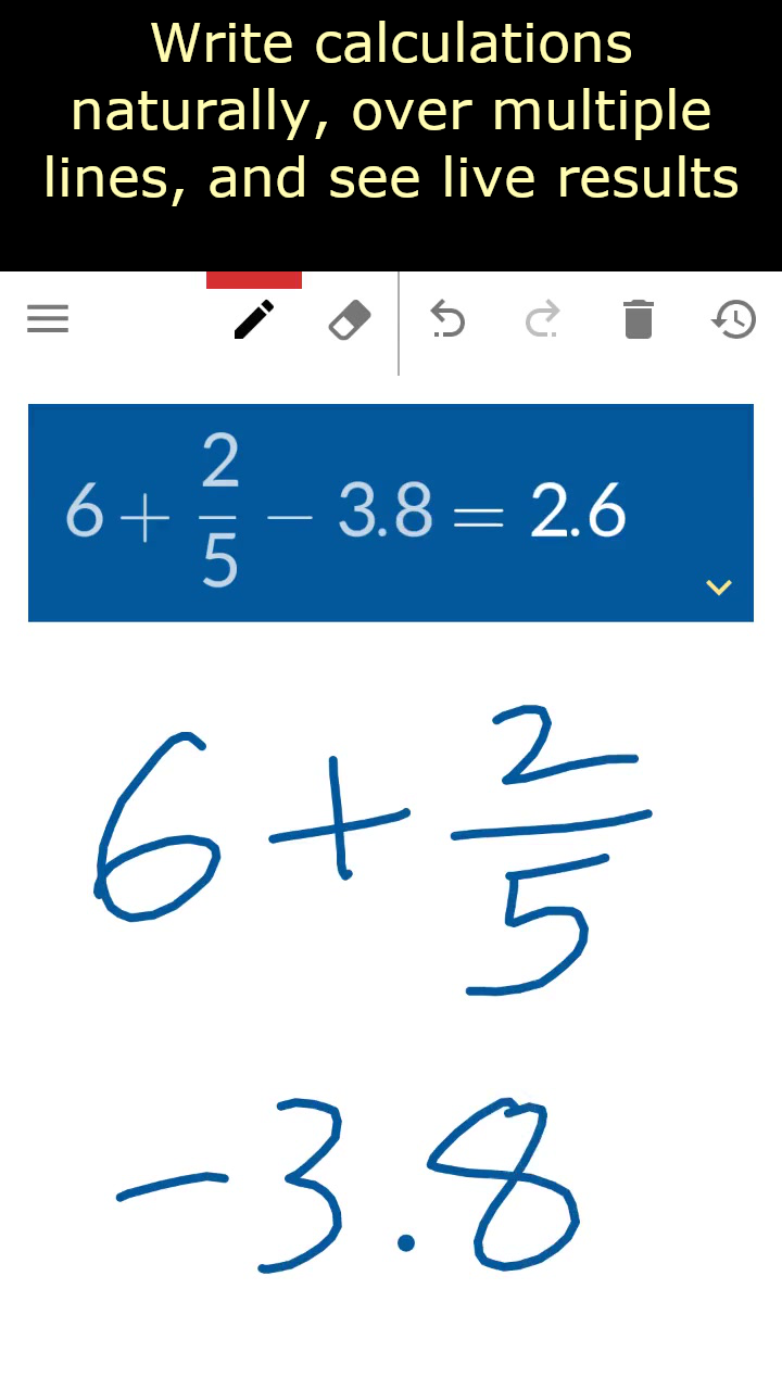 Papercalc is the way a calculator was meant to be. Simply write calculations in handwritten script and see live results. Span multiple rows or add lists of calculations. Easily edit previous results, save intermediate results, and re-use previous calculations with drag and drop. Papercalc calculates everything you do virtually instantaneously. Ideal for fractions and tape style calculations.