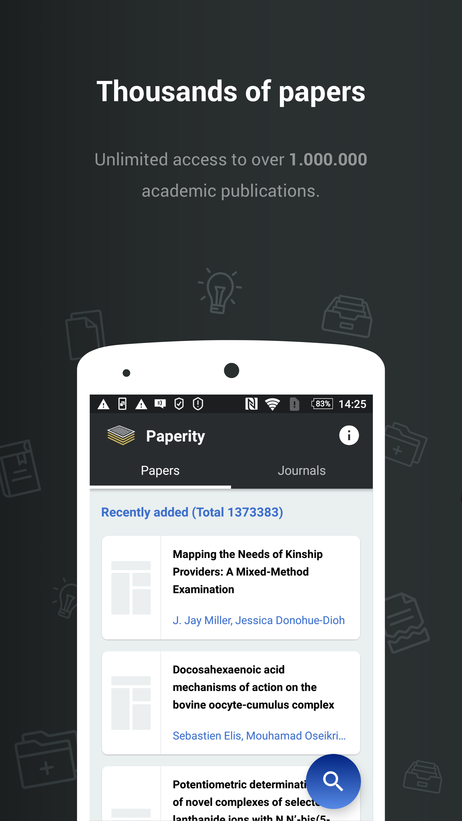 Paperity (www.paperity.org) is the first multidisciplinary aggregator of Open Access journals and papers, "gold" and "hybrid". It: - Gives readers easy and unconstrained access to thousands of journals from hundreds of disciplines, in one central location. - Helps authors reach their target audience, disseminate discoveries more effectively and maximize research impact. - Raises exposure of journals, boosts their readership and encourages new manuscript submissions. Paperity is the way towards more efficient scholarly communication in all research fields, from Sciences, Technology, Medicine, to Social Sciences, to Humanities and Arts. Our ultimate goal is to aggregate 100% of Open Access literature, published in any place around the world, in any field of research. FEATURES With Paperity Reader you can access 1,000,000+ scholarly articles from Paperity service right on your mobile: - Browse most recent articles. - Browse journals and their Tables of Contents of Open Access papers. - Search papers and their full text for specific keywords, phrases, authors, publication dates, languages, countries of origin. - View and read full-text PDFs of articles. All for free. No paywalls!