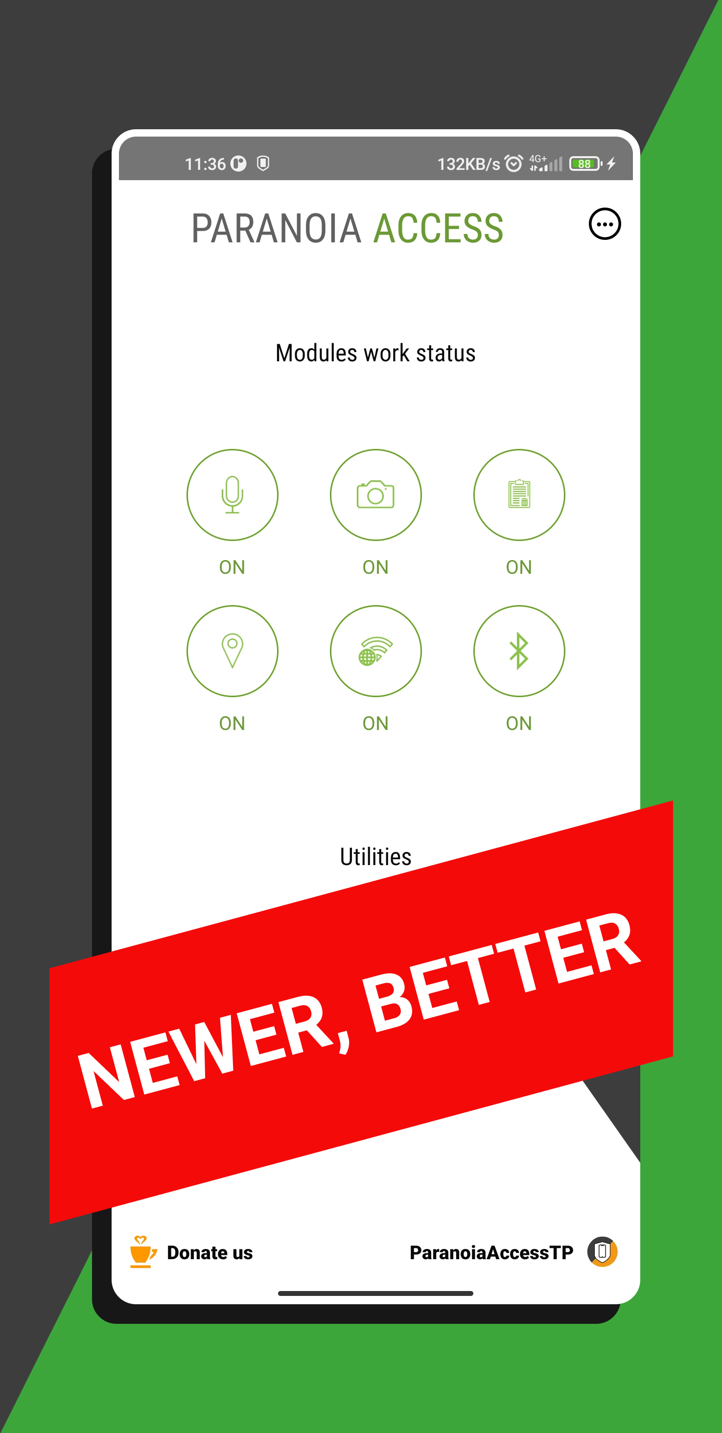 The block microphone uses a lot of power and lock camera requires administrator rights for the app, which compromises the security of your phone. Phone anti-spyware mute mic will notify you when the microphone is on. 🔒 Microphone activation control The renewed Paranoia Access without wasting power protect your camera and microphone on a regular basis. The application will take care of your privacy and keep your phone safe. 🔒 Camera activation control Some applications use a hidden camera and include a microphone for eavesdropping, but Paranoia Access monitors in control mode. ✅ When the phone turn on the microphone, you receives a warning signal (sound or vibration). ✅ The application will warn about turning on the camera and GPS. ✅ Instant notifications and alerts. ✅ Mute mic & mic block. 🔒 WI-FI privacy protaction Paranoia Access is an excellent anti-listening antispyware, and the application is also used to increase security in public wi-fi networks. Wi-fi network monitoring provides security and sends an alert if client isolation is not configured. Wi-fi protection, camera guard and microphone guard are great additions. 🔒 Stealth mode Bluetooth The "invisibility" mode of Bluetooth, with the exception of previously paired devices, ensures invisibility in a public place. Keep your phone safe in any public place. 🔒 Clear clipboard automatically Automatic clipboard cleaning does not allow collecting information about the user based on data from the clipboard, for example, by phone numbers, websites, passwords, card numbers that were previously copied. The Paranoia Access module automatically clears the clipboard whenever you turn off your phone screen (or every 30 seconds after copying, set in the settings). 🔒 Photos without EXIF Metadata of digital photos is an invisible information about the attributes and characteristics of a photo, created in automatic mode and essentially is like a fingerprint. When you share a photo on the Internet, this data becomes available for analysis to anyone. The "Photo" utility allows you to take photos with rectified metadata easy and quickly. Through the settings you can choose what you want to keep in Exif. Convenient antispyware phone mute mic and mic block works in the background without the Internet, monitors the network, notifies in a convenient mode. Paranoia Access is a reliable camera and microphone protection. We will be grateful for the feedback left on the XDA website: https://forum.xda-developers.com/android/apps-games/app-paranoia-access-t4161501
