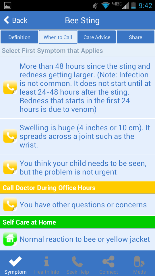 What should you do if your child develops a fever, cough, vomiting, rash, sore throat or head injury? What should you do about behavioral issues, from toilet training to teaching responsibility to teenagers? These are questions that all parents have. Health problems and parenting issues can arise anytime – evenings, weekends, when you’re at work or traveling or your doctor’s office is closed. ParentAdvice Center is designed especially for these concerns and challenges. The Symptom Care Guides help you make smart decisions on what level of care (if any) is needed and how to provide speedy symptom relief for minor illnesses or injuries you can manage on your own. ParentAdvice Center is derived from the clinical protocols used by pediatricians and nurses in 10,000 practices and 400 nurse advice call centers in the US and Canada. They have been tested for 15 years on more than 150 million symptom calls. The 145 Parent Advice Messages deal with the most common behavior and wellness questions parents ask their physicians. Each topic provides a description of the issue, three to five specific recommendations to address the concern, and (often) additional resources which may be useful to your situation. Symptom Checker Features Easy 3-step navigation: 1. Choose the most appropriate symptom care guide 2. Use the symptom decision chart to find the recommended action 3. Follow the self care advice to make your child more comfortable The care guide that best matches your child’s symptom can be located quickly by using the alphabetical index, body area index, or keyword search. Content - each symptom care guide contains: * Definition which describes the focus of the care guide so you can decide if it’s a good fit for your problem. If not, there are quick links to related guidelines. * Decision Chart which helps determine what action is suggested based on the severity and description of your symptom. Once you have a match, simply follow the corresponding action, such as Call 911, Call Your Child’s Doctor Now, Call Your Child’s Doctor within 24 hours or Manage at Home. * Immediate Connections to medical help, such as 911, your child’s practice or nearby Emergency Department (ER) are available if you have phone service. * Home Care Advice is available for any illnesses and injuries that can be treated at home. The instructions provide clear, up-to-date steps for relieving symptoms. Extras: * Medication and Allergy List for tracking important information about your family’s prescriptions and/or over the counter medications. * Pediatric dosage tables by weight for common over-the-counter medications. * Visual images to help you identify symptoms (e.g. rashes), injuries and common causes of bites & stings. * First Aid topics and illustrations to support immediate action, if needed. Disclaimer: The information provided with this Application is not a substitute for professional medical or behavioral advice, diagnosis or treatment; it is for informational purposes only. Talk with your healthcare provider about any questions you may have regarding a medical condition. If you think your child may have a medical emergency, call the doctor or 911 immediately. Before using ParentAdvice Center, all users should read and agree with the full Disclaimer available in the application within More > Terms and Conditions.