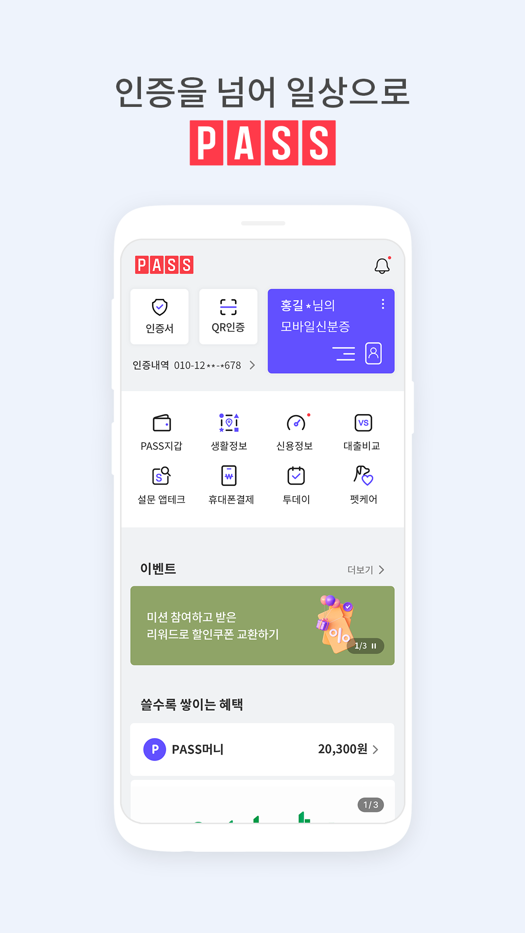 [Service Introduction] - Enjoy a variety of lifestyle services, from quick and easy authentication to financial product comparison, through the PASS app. [Service Eligibility] - KT Mobile/KT MVNO (Cheap Phone) Customers ※ Anyone aged 14 or older can conveniently use the app. ※ Foreigners who can verify their identity through mobile phones and corporate customers who have signed up for corporate identity verification services can also use the app. (However, mobile micropayments are not available for those under 19 or with corporate-named phones.) [Key Features] - Easy Identity Verification: Securely verify your identity using your 6-digit PIN, fingerprint, or other information registered with PASS, without worrying about smishing. - Mobile Payment: View your mobile payment history and use barcode payments. - Driver's License Mobile Verification Service: Your driver's license is now on your phone, allowing you to register your physical driver's license information with PASS. - Resident Registration Card Mobile Verification Service: You can check the information on your resident registration card on PASS without a physical resident registration card. - PASS Certificate: This certificate, certified by the Digital Signature Certification Business, allows for safer and easier use. - Financial Products: Provides information on a variety of financial products, including loans, cards, insurance, and savings accounts. - Loan Comparison: Easily compare loan product interest rates and limits that best suit your needs (credit, home equity, auto equity). [Note] - Available for Android OS 8.0 and higher. Fingerprint authentication may not be supported depending on your phone model. - This service is not supported on tablets, smartphone accessories, or Wi-Fi-only devices. - When installing and running the app in a 3G/LTE environment, data call charges may be deducted or charged depending on your plan. - When using the app overseas, data roaming charges may apply if the device is not connected to Wi-Fi. ※ For any other questions or suggestions, please use the "Email Developer" option in the Additional Information section. We will respond promptly and accurately. [PASS Access Permissions and Reasons for Needing Them] 1. Required Access Permissions #Phone Permission: PASS by kt collects, transmits, and stores phone numbers for user authentication when launching the app, collects app usage statistics, verifies customer location information and history management for mobile driver's license verification, and verifies customer information when calling customer service to resolve customer inconveniences. #Storage Permission: Required for certificate signature file storage and information management, storing issued electronic receipts, storing pet insurance subscription certificates, and storing mind care content. (Obtained only for OS 12 and below) 2. Optional Access Permissions #Camera: Used for QR code authentication and driver's license registration, driver's license/resident registration card facial authentication, ID verification, PASS wallet profile settings and certificate use, and pet care patellar dislocation screening. #Location Information: Used to verify the device's location when sending driver's license verification and to check nearby pet access points based on pet service area location. #Notification: Required for push notifications. #Contact: Used to enter the recipient's name and phone number when creating a PASS wallet certificate. #Physical Activity: Used to measure steps with the healthcare pedometer. *You can change PASS permissions in the Settings app > Application Management > PASS App Permissions menu on your phone.