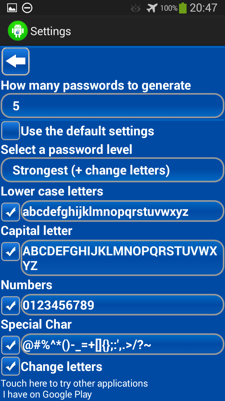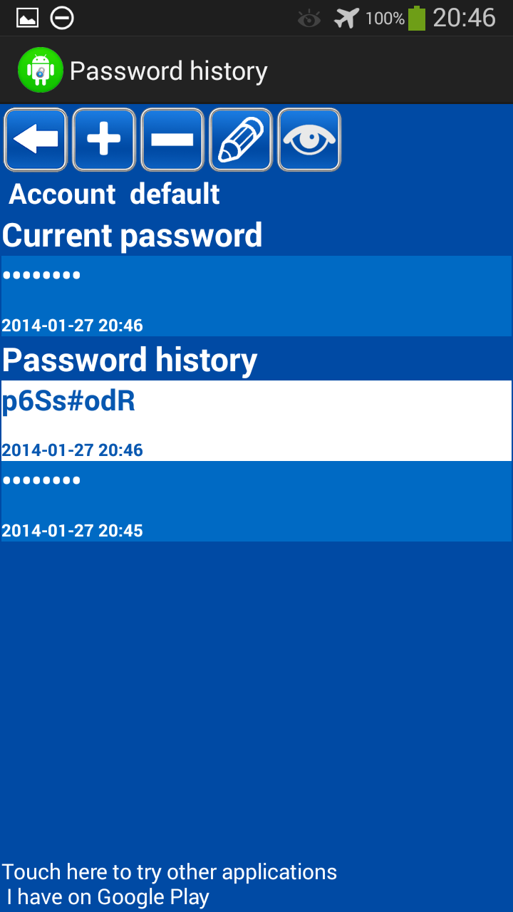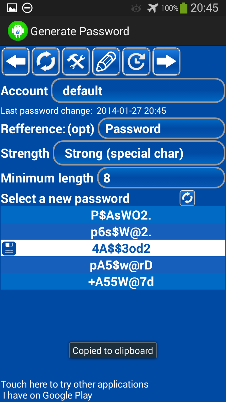 Password Generator Free (Package Name: com.logan19gp.pswgenfree) is developed by GEORGE and the latest version of Passwords & Numbers Generator 2.45 was updated on March 2, 2014. Passwords & Numbers Generator is in the category of Tools. You can check all apps from the developer of Passwords & Numbers Generator and find 6 alternative apps to Passwords & Numbers Generator on Android. Currently this app is for free. This app can be downloaded on Android 1.5+ on APKFab or Google Play. All APK/XAPK files on APKFab.com are original and 100% safe with fast download.