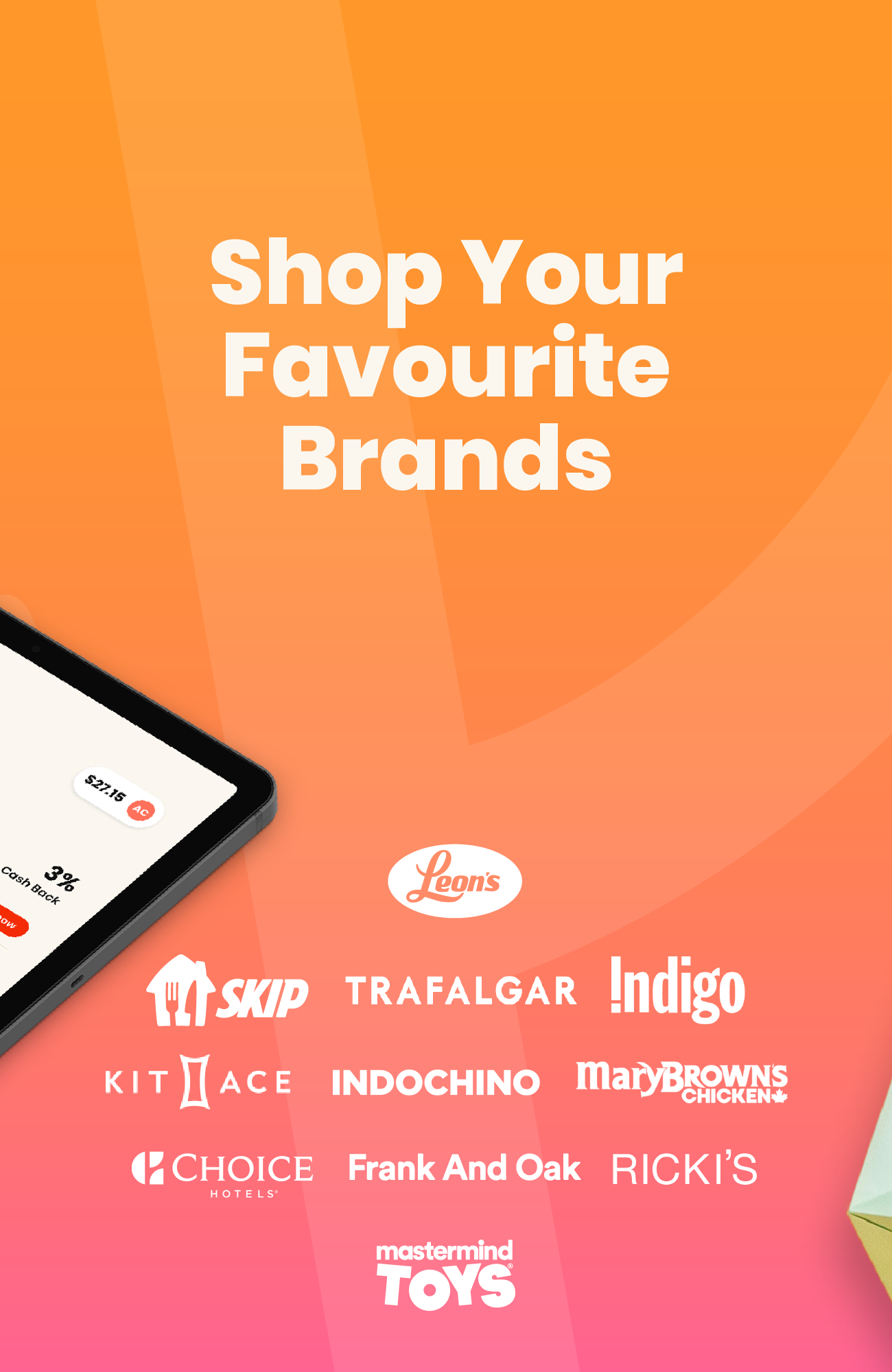 Experience seamless cashback rewards on your everyday shopping using linked bank or credit cards. Get cashback from renowned brands including Mary Browns, Kernels Popcorn, Mastermind Toys, Mabels Labels, Bass Pro Shops, Cabelas, Fat Bastard Burritos, SkiptheDishes, Indigo, Hello Fresh, Chefs Plate, Apple, Sportchek, Endy, Disney+, Mejuri, Walmart, and Best Buy, to name a few.