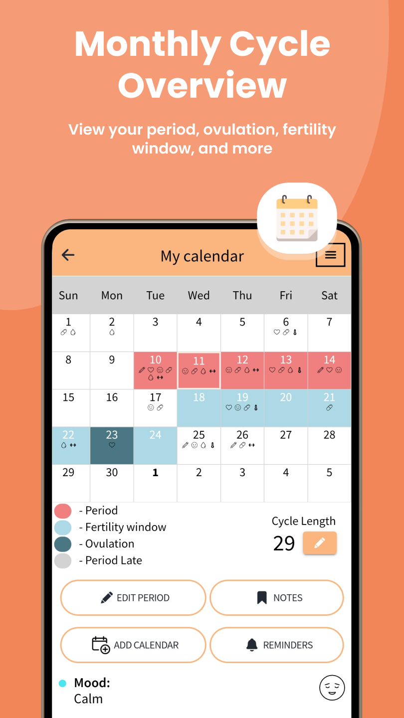 🌸 Period Calendar: Visualize your entire menstrual cycle on an intuitive calendar, complete with detailed logs of symptoms and flow. Track your period length, heaviness, and dates in one place to help you stay organized.