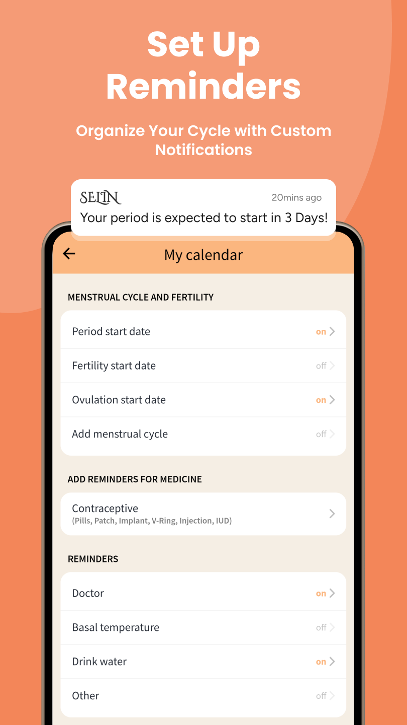 🌸 Custom Reminders: Set reminders for important cycle moments like ovulation, period start, fertility window, birth control, and doctor visits. You can even set reminders for personal routines like water intake or exercise.