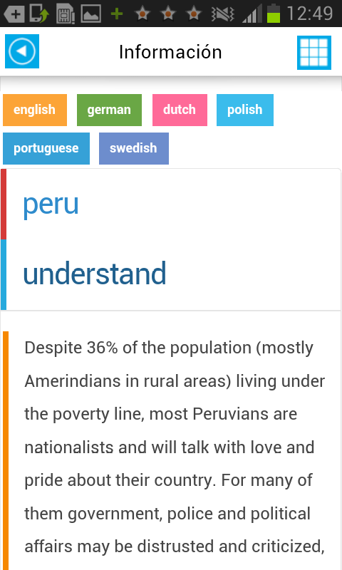 Peru Offline Road Map & Guide (Package Name: off.guide.maps.peru) is developed by Free Offline Maps & Guides and the latest version of Peru Offline Road Map & Guide 5.0 was updated on October 2, 2014. Peru Offline Road Map & Guide is in the category of Travel & Local. You can check all apps from the developer of Peru Offline Road Map & Guide. Currently this app is for free. This app can be downloaded on Android 2.3.4+ on APKFab or Google Play. All APK/XAPK files on APKFab.com are original and 100% safe with fast download.
