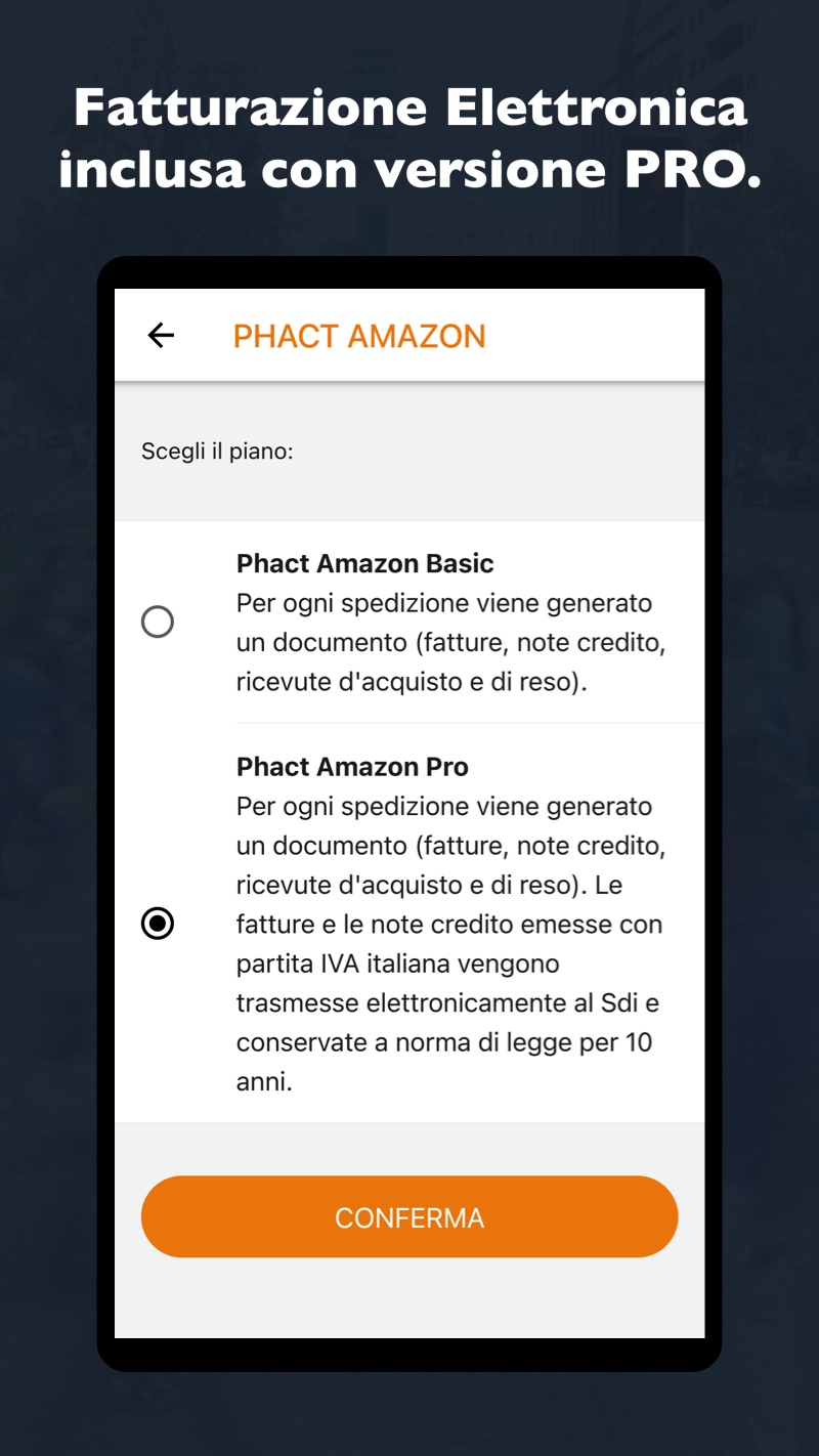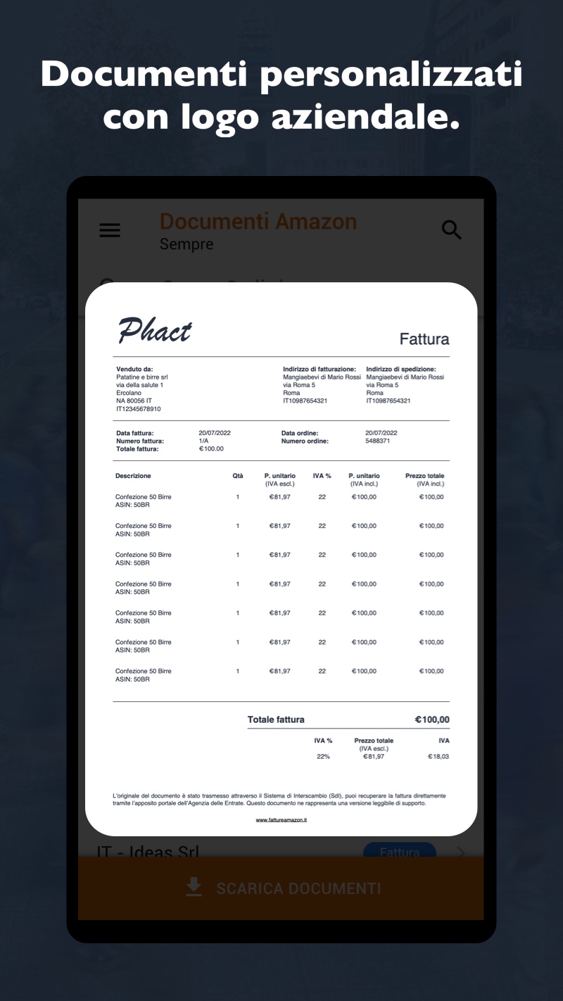 Are you an Amazon Business seller? Make your life easier with Phact Amazon! For each shipment, we can automatically generate your invoices, credit notes, purchase receipts and return receipts (even if you are in the Flat Rate Scheme). You will be able to graphically customize the documents with your company logo and define the numerical series of the documents by type of document and by country of issue. Once the purchase has been made, Amazon customers will be able to download the pdf documents from their Amazon panel within 2 hours of shipment. You, on the other hand, will find the documents generated in your management system (automatically with our API) to integrate accounting and warehouse. With the PRO version of Phact Amazon, your electronic invoices and credit notes issued with an Italian VAT number will be automatically sent to the Revenue Agency and kept in accordance with the law for 10 years. If you want to receive electronic invoices and credit notes from suppliers, remember to enter the recipient code 596NUAX in your tax drawer. Your accountant will be able to access our online panel (Phact XML) and download all invoices (issued and received) with a single click. If you choose the BASIC version of Phact Amazon, remember to send the generated documents to the Revenue Agency within 12 days. FLAT SCHEME? Problem solved. If you are on a Flat Rate Scheme, your electronic invoices and credit notes will have the nature of N2.2 exemption and RF19 regime reference. Your courtesy documents will have the mandatory wording required by law and on documents that exceed the amount of € 77.47, we will add a second wording for the 2 euro revenue stamp. Furthermore, we will summarize the total amount of stamps to pay with F24 every three months. MANAGEMENT INTEGRATION If you don't use Phact as your management software, you can use our APIs to connect your management system to Phact Amazon. This way you won't have to do manual work to import your documents, and you can easily integrate accounting and inventory. If you choose the PRO version of Phact Amazon, invoices and electronic credit notes will be sent to the SDI automatically. If you choose the Basic version of Phact Amazon, remember to send the generated documents to the Revenue Agency within 12 days. BUSINESS CONSULTANT Your accountant's work becomes easier with the connection to Phact Amazon and the ability to find all documents issued in CSV, XML and PDF format. Furthermore, Phact Amazon provides your accountant with the summary of INTRASTAT documents, the OSS summary, the summary of the daily Fees and the Quarterly Stamps to be paid with F24 for companies in the Flat Rate Scheme. Those who choose the PRO version will have an additional control panel (xml.phact.cloud), dedicated exclusively to electronic invoices and credit notes with the related SDI notifications. Learn more about Phact XML. Find out more on www.fattureamazon.it