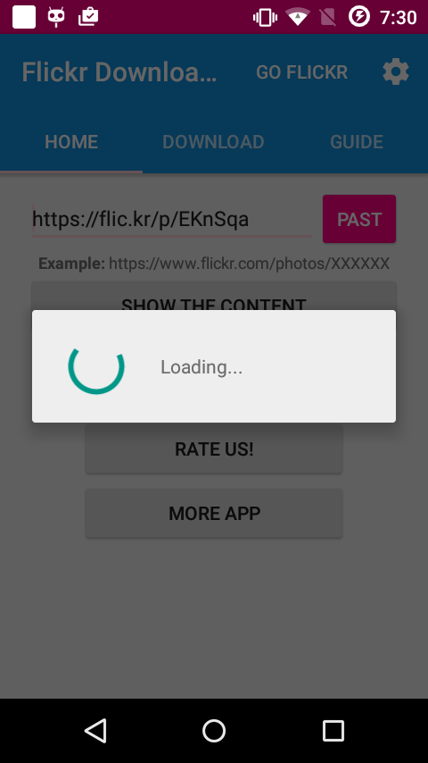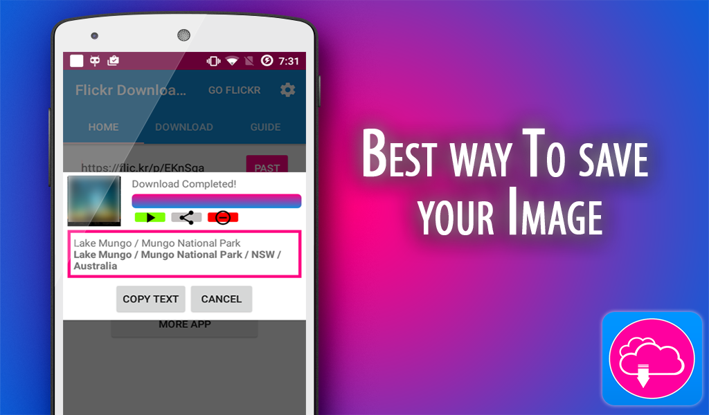 Go app Flickr , and hit share button than click "Copy link" , and go to my app called flickr Download click button called "PAST" when loading Finish Hit button SAVE IMAGE. you can manage them in tab "DOWNLOAD". Thats it