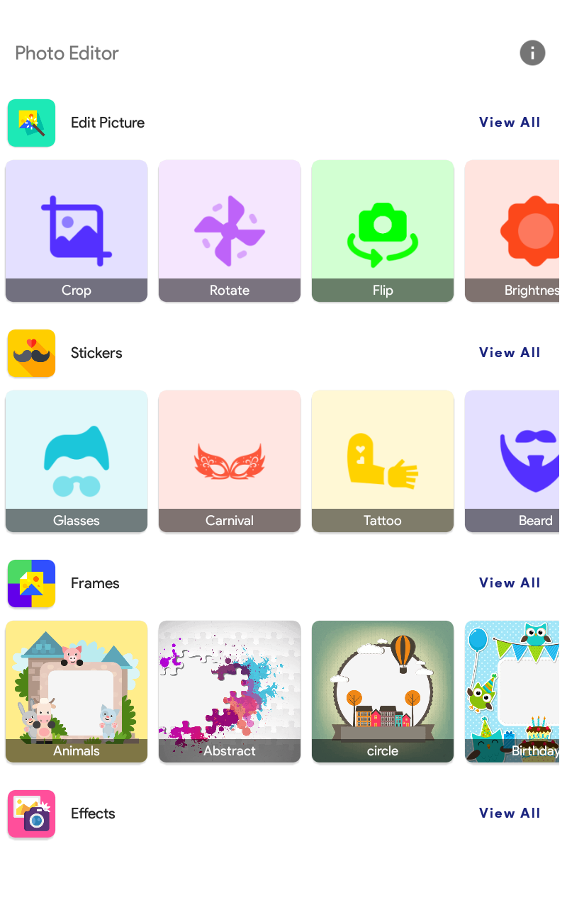 Version 1.1.15 ✓ Photo Editing - Cropping, Rotate, Flip, Brightness, Contrast etc.. ✓ Photo Effects - Variety of stunning Photo Effects ✓ Photo Filter, Photo Frames - Hundreds of filter options and elegant frames to make your picture more beautiful. ✓ Photo Montage, Photo Drawing, Photo Text and much more... ✓ New look and design, latest Androd (Android Pie) Supoprt