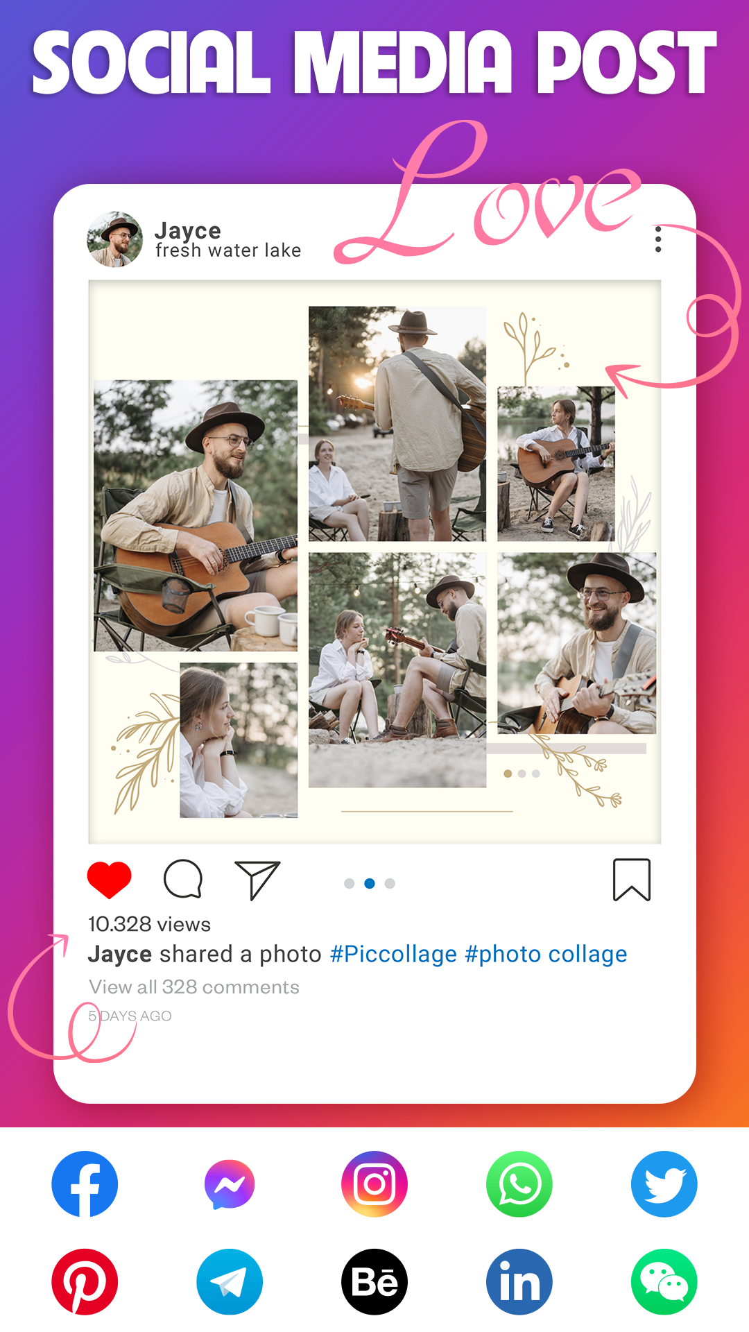 Seamless Integration and Sharing:. Effortlessly share your masterpieces on social media. In our photo editor, a single tap lets you post your pic collage on Instagram, Facebook, or Twitter, showcasing your creativity and leaving a lasting impression.