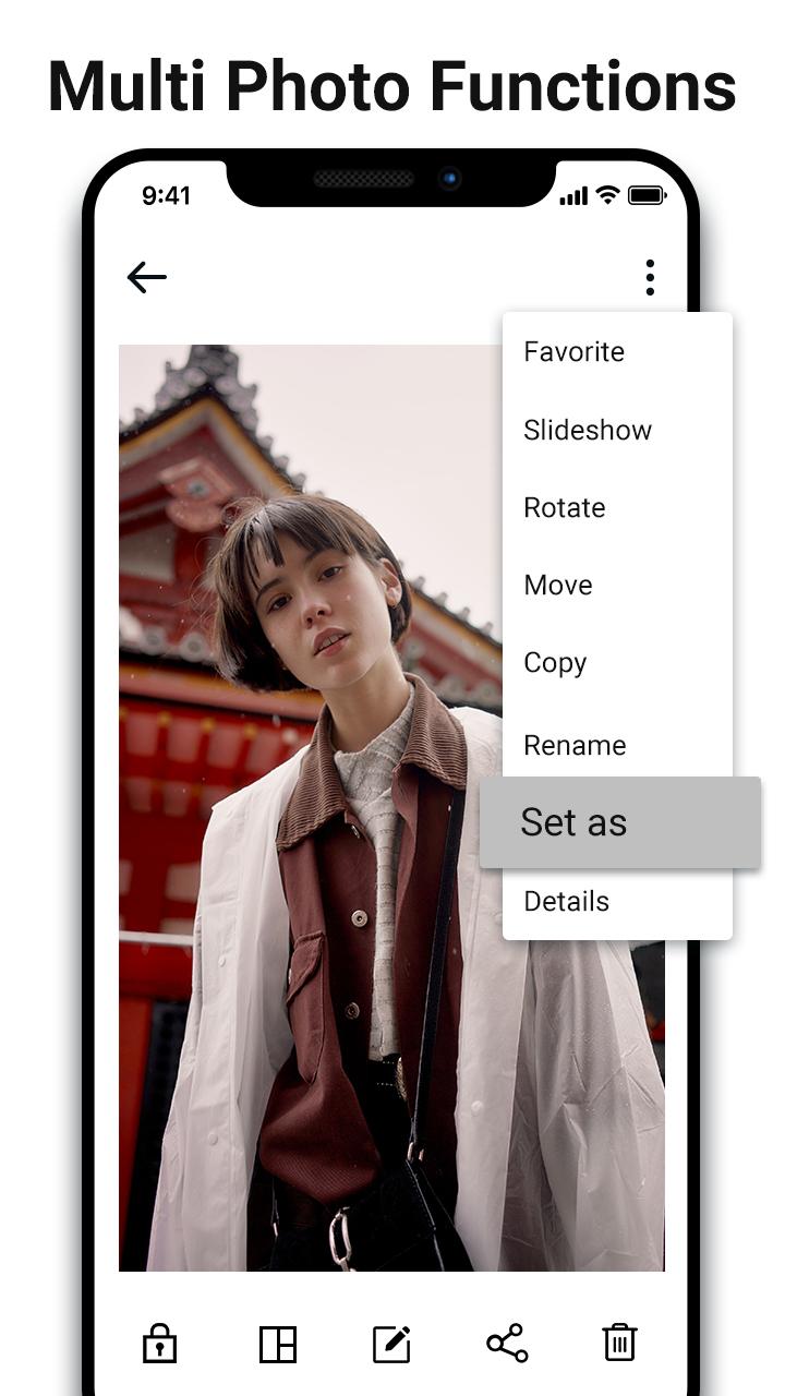 The best photo gallery and photo browser&manage app in android market. Photo gallery wish everyone can preview and manager their pictures in a quicker and easier way. Feel free to management your photo gallery, easy edit your hot photos, and share your moments. Key Features: - Hide your private photos and videos - Protect private photos and videos via encryption - Supports all the popular image formats. - Easy to show 1000+ pictures in few seconds, quick access and find all new pictures. - Preview your album as slideshow in best quality effects - 3D effect , more realistic aesthetic feeling - Smooth experience: sliding shift or switch, single or double tap or pinch to zoom. - Photo editing: Rotate, shrink, crop pictures, set wallpaper with best quality - More file management features: sort, rename, create new folder, move and copy pictures - Optimized for HD tablets - Browse all pictures , pictures will be set as wallpaper , may to the images cut , rotate , amplification , narrow - Delicate interface design - Best quality full-screen browser - Extensible personalized slide play, clear thumbnail preview - Sharing photos via SMS , E-mail and etc.. - Fluent experience: sliding translation or switching, click or double-click or double refers to scale the image Notice: * For users with Android 11 and above, the "MANAGE_EXTERNAL_STORAGE" permission is required for the proper operation of file encryption and management features. Foreground Service Permission Declaration: By running the gallery as a foreground service, the video can continue playing in the background even if the user exits the video playback interface. In this way, users can control video playback directly from the notification bar and continue to listen to video content without reopening the gallery app.
