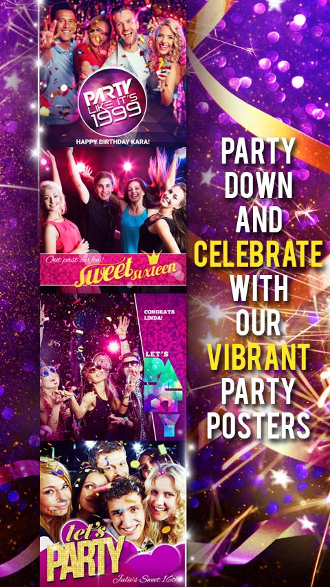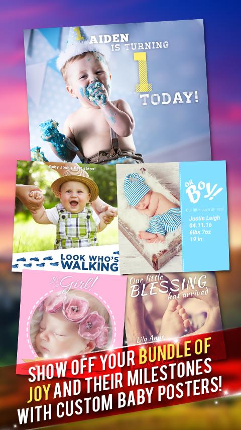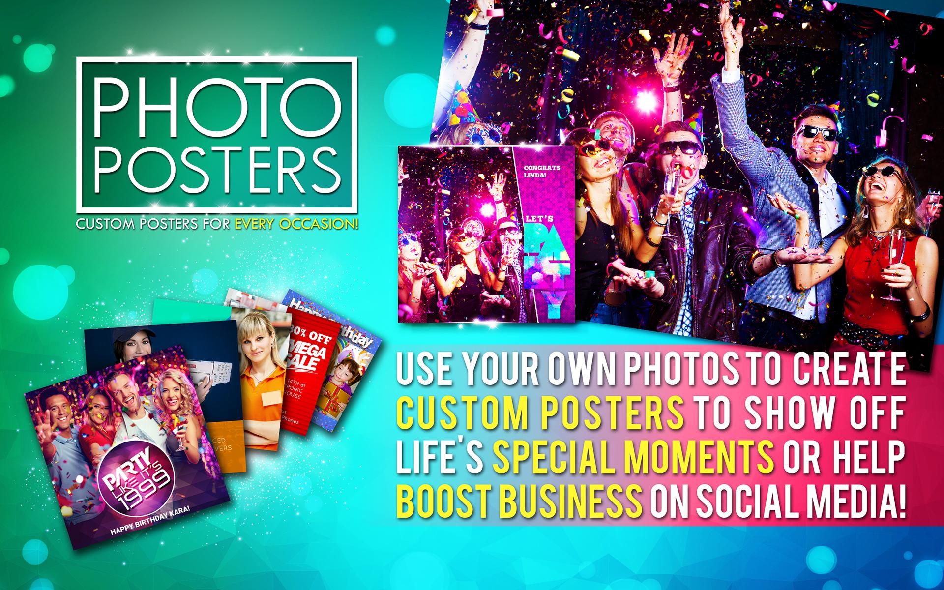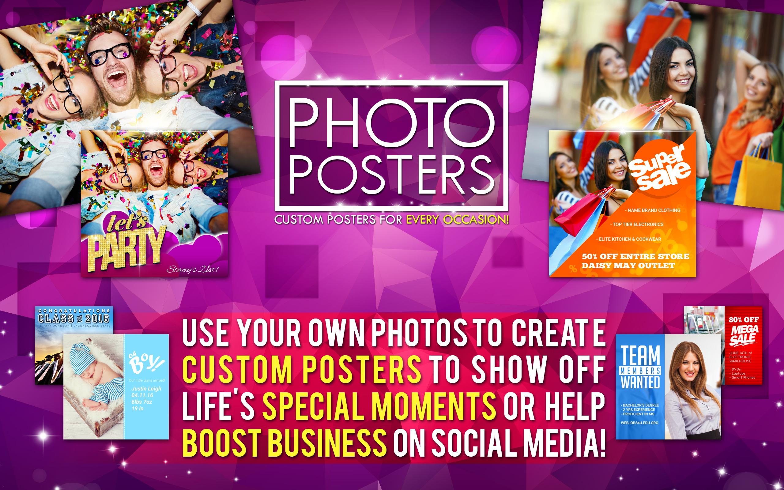 Eight Categories of Photo Posters added with 10's of Photo Posters: Baby Posters, Graduation Posters, Wedding Posters, Birthday Posters, Party Posters, For Sale Posters, Missing Person Poster Maker, Job Posters. Support for Older devices.