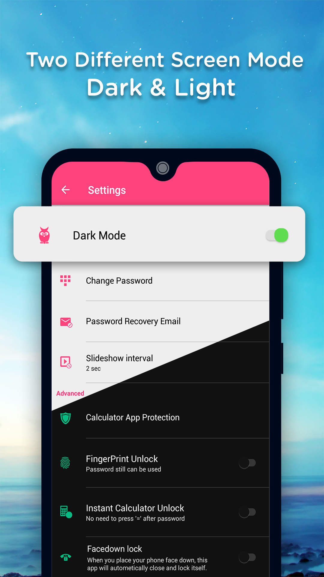 Use the best calculator photo vault to hide photos, hide pictures, hide videos and lock App with Pin, Pattern, fingerprint Calculator Vault is completely free to Hide unlimited Pictures, Videos and App . Really want secret locker for your personal files in your phone? you can not skip this app. Keep safe gallery and No need to worry when giving your smart phone to friends and family when Smart Photo Vault app installed in your phone. How to use : - Hide Pictures and Videos : Click on Plus Button at the bottom of main screen and then select media from gallery and click lock button to hide into Photo,Video Locker-Calculator app. - Lock Apps: Go to App Lock tab on main screen and Lock your Apps by selecting them to keep safe from others. - Intruder Selfie: Enabling intruder selfie lets you capture intruder's photo and show them when you entering into smart hidden calculator. - Fake Cover: you can enable advanced security where you can set fake cover of Force close of applications which are locked and only you know trick to open your app lock interface. - Finger print app lock: you can enable your fingerprint for locked apps to open it without password instantly. it also used for your smart hide calculator. - Wi-fi security: now you can have control over your switched like wifi and Bluetooth by our strong app lock security Features: • Access Photo,Video Locker by typing Numeric PIN on calculator vault of this app. • Lock apps using Classic PIN pad. • Support all Picture formats in gallery lock like GIF, JPEG, PNG etc. • Backup PATTERN UNLOCK. • Beautiful Themes for calculator and app lock screen. • Easy to Manage, Delete, Unhide, Move Pictures in gallery vault. • Amazing Inbuilt Image viewer with Slide show, Rotate, Share and Shuffle option. • Supports app protection to prevent Calculator from being uninstalled by strangers. “This app uses the Device Administrator permission.” You can activate device Administrator permission for this app to prevent accidentally Uninstallation of app and avoid loss your data. • Powerful and Instant Lock Apps system to keep safe your private media. • Finger Print unlock for both calculator and app lock for supported devices. • Intruder Selfie. Instant selfie captured when someone tried wrong password on your app lock. • Fake App lock cover. Enable double security or fake screen over your app lock. you can set force close app screen for locked apps. • you can lock wifi and bluetooth with password protection of app lock. • Disappears from recent apps list. • Dark Mode feature helps to secretly open personal photo,video locker during night without anyone knowing. USEFUL TIPS : - Forget Password? Recover Password by your registered e-mail id and regain access to the app. - Change PIN? Go to Settings tab and click on Change Password. - Unlock Media? After you Hide pictures and Videos from this gallery lock, use unlock button in this app to unhide media whenever needed. - Advance Protection? Turn “ON” app protection option from settings after you Hide pictures and Videos to keep safe without losing it. - Relax and View Images? Use SlideShow option and set slide interval from settings. - Beautify: Use Theme icon to change color of Lock Screen so you don’t get bored.