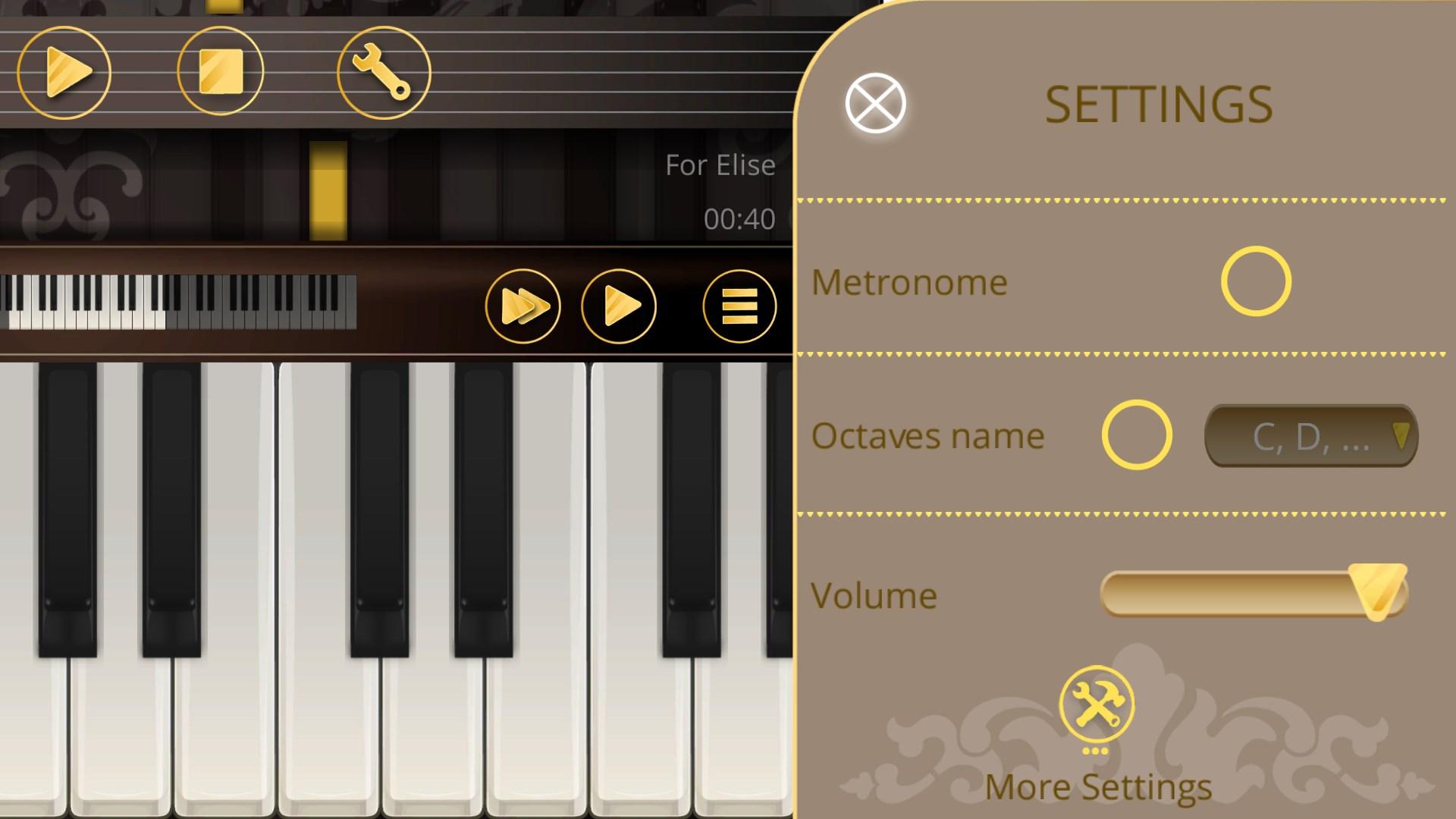 The application can also be used as a piano without learning mode. You can set the amount of visible piano keys from 8 to 16. If it is more comfortable for you, set the key signature. You can also turn on the metronome.