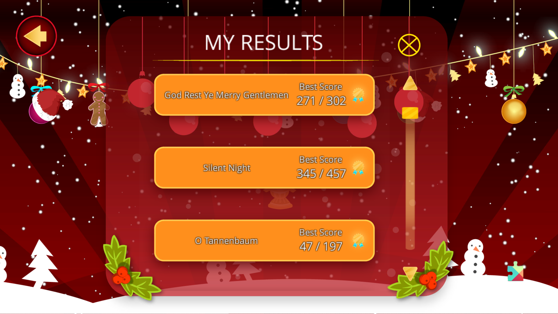In Career Mode you have to choose a Christmas carol from the list and click the play button. Click on the highlighted blue keys and play the whole song! The application will rate your performance. Become a champion and get 100% for each played Christmas carol!