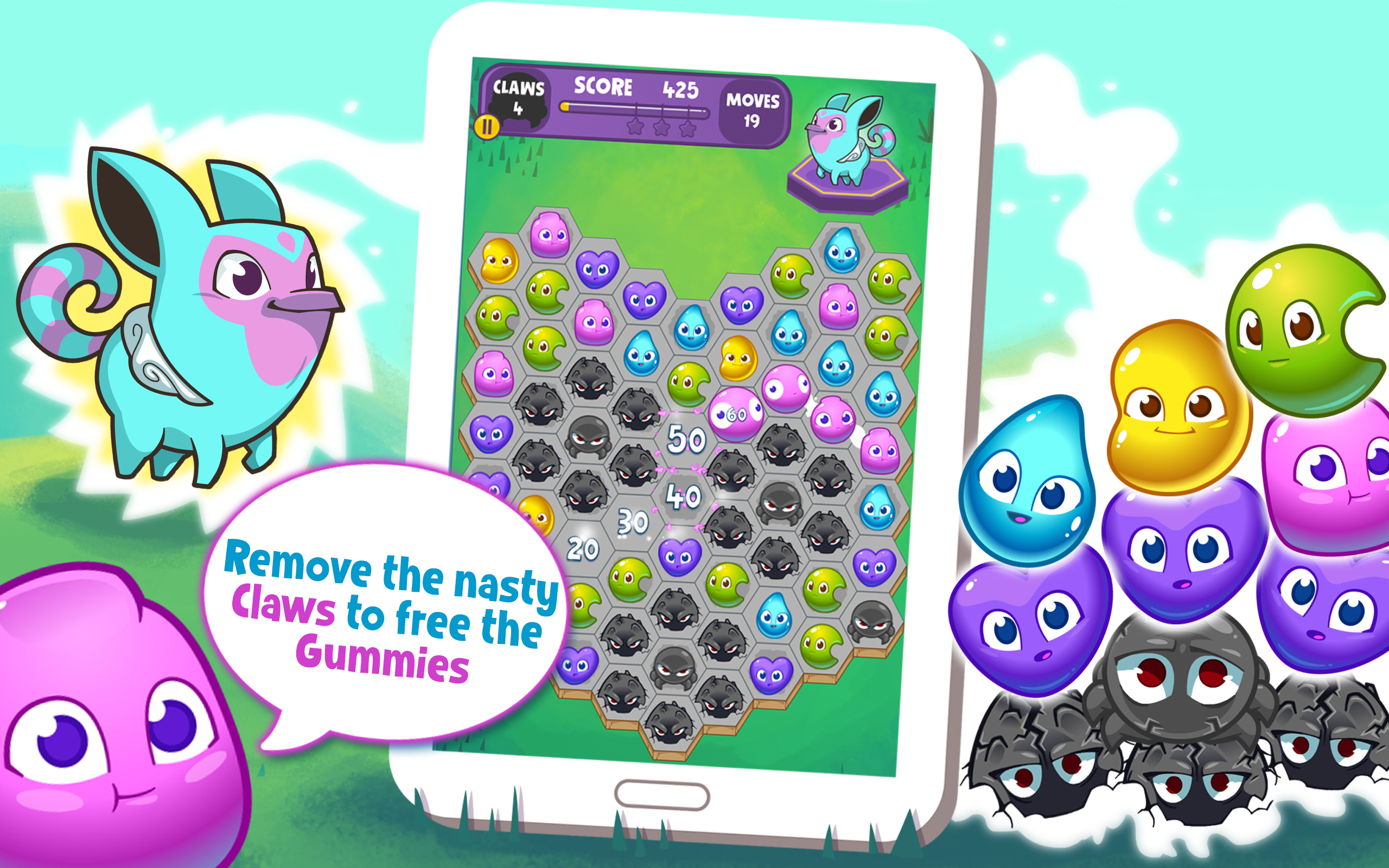 Link the gummies in chains of 3 or more to activate your pet's superpower and help you overcome tricky puzzles such as clearing out Claws, cleaning up oil spills and rescuing trapped gummies.