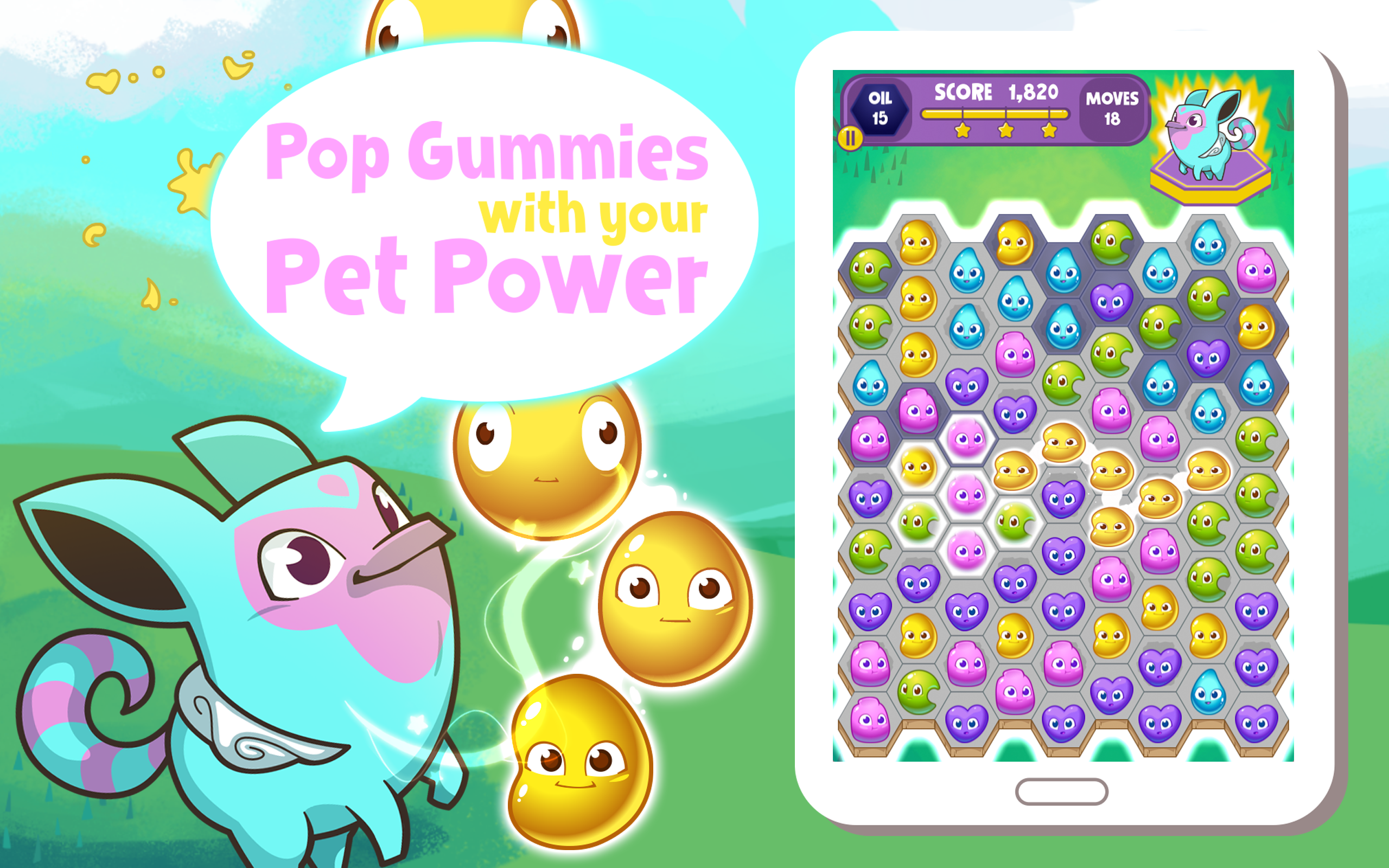 Feed and level up your pets to increase their power to help solve new, more formidable puzzles. Journey through the map to unlock more devastating pet moves and match higher gummy chains to obtain massive scores to beat your friends to the top of the leaderboards.