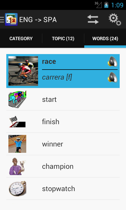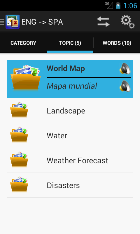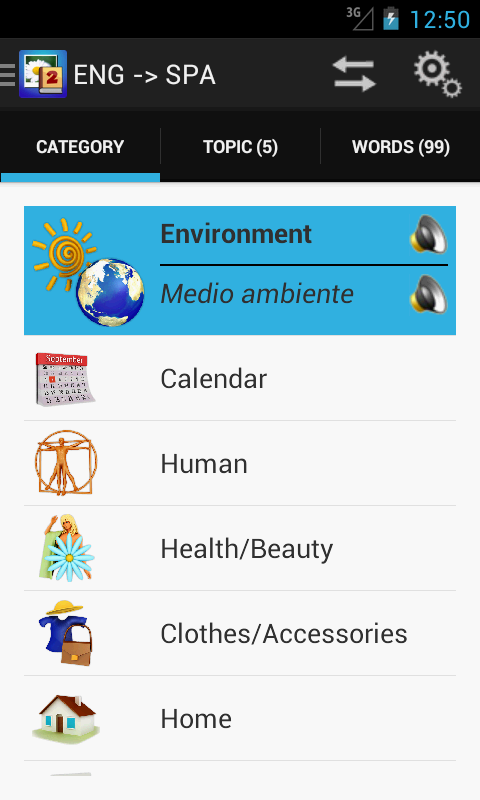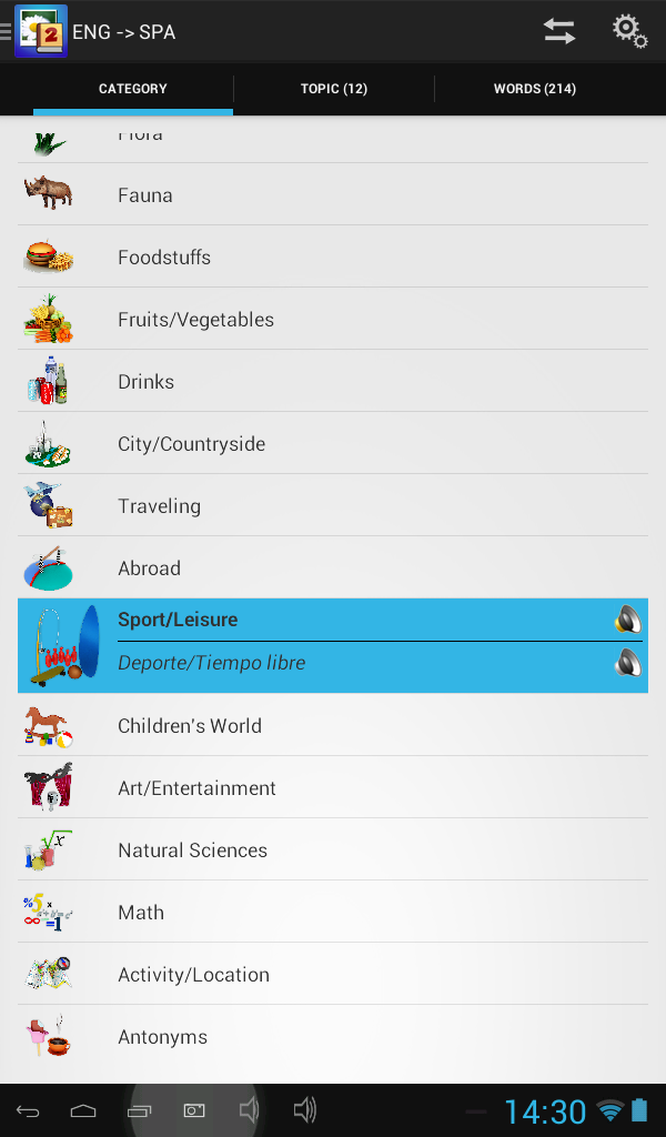 Cross language means that you can translate between any of the 39 languages with no limit: Albanian, Arabic, Armenian, Bosnian, Bulgarian, Chinese, Croatian, Czech, Danish, Dutch, English, Estonian, Farsi, Finnish, French, German, Greek, Hebrew, Hindi, Hungarian, Indonesian, Italian, Japanese, Korean, Latvian, Lithuanian, Norwegian, Polish, Portuguese, Romanian, Russian, Serbian, Slovak, Spanish, Swedish, Thai, Turkish, Ukrainian, and Vietnamese. You can translate words from Korean to Russian or even Vietnamese to Slovak instantly. Each word has a corresponding picture and FLUENT HUMAN PRONUNCIATION so you can memorize it easier and even have a pic to reference it to. The words are arranged into 22 categories: Environment, Calendar, Human, Health/Beauty, Clothes/Accessories, Home, Computer/Office, Flora, Fauna, Foodstuffs, Fruits/Vegetables, Drinks, City/Countryside, Traveling, Abroad, Sport/Leisure, Children's Word, Art/Entertainment, Natural Sciences, Math, Activity/Location, Antonyms. You can choose from among a number of topics within each category.