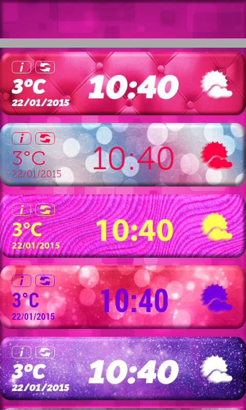♥ Pink Clock Weather Widget ♥ is the most beautiful widget for your phone screen! Pink color is popular all around the world with girls of all ages. Want to have a cute and fashionable clock on your screen? Want to have romantic pink widget? Close your eyes and imagine beautiful pink clock. Download “Pink Clock Weather Widget” and set this adorable clock to decorate your screen. 10 digital clocks, 5 unlocked and 5 locked. Every day new clock is available. Put wonderful clock widget on your home screen. Top widgets of different sizes and shapes. Easy to use for adults and children. Add widgets to beautify your screen. Pink is the color of happiness! These lovely clocks will make you feel happy whenever you look at your screen. So, get “clock widget” as soon as possible and enjoy. Choose the most beautiful “digital clock widget” and dress your phone screen in pink. If you are bored with your old digital clock, try new ♥ Pink Clock Weather Widget ♥. This widget contains the most beautiful girly pink digital clocks. A clock widget that displays the time, the date and even the weather offers different pink designs to choose from. No matter which Android™ phone you’re using ♥ Pink Clock Weather Widget ♥ is perfect for you. See the weather temperature outside without watching the weather channel. You are able to see both in Celsius and in Fahrenheit measurement units. You will have your own weather forecast with this pink “weather widget”. You will know whether it raining or snowing. Just select a location and see local weather. And what about the world weather, find out whether it’s warm and sunny or it’s cold and rainy in your favorite city. Awesome girly widget clock and weather is a perfect decoration for your home screen. This awesome free widget is for everyone’s taste. Just imagine a magical pink clock on your screen. Pink clocks are waiting for you! Your cute clock will keep you gay and jolly. Girly clocks are a click away from you. Set these gorgeous clocks and enjoy your new screen look free of charge! This free app is created especially for girls who are crazy for pink color. Download ♥ Pink Clock Weather Widget ♥ and have fun with your girls. This free widget clock is a perfect gift for your kids, for your little girls. Cute pink time and date widget will make them extremely happy. If your little girls like pink color, set these adorable clocks and make them happy. They will be amazed when they see your Android™ phone screen covered with their favorite color. Get “digital clock” and beautify your screen completely free of charge. Download ♥ Pink Clock Weather Widget ♥ and provide yourself a huge amount of happiness. Fabulous pinky widgets to pretty up your home screen are a click away from you! New designs are added every day! Download ♥ Pink Clock Weather Widget ♥ and enjoy the digital clock on your screen. Get clocks completely free of charge and provide perfect “widgets for Android™” for your new Samsung Galaxy mobile. These clocks and calendar widgets not only they are functional, they are unique and personalized. Beautiful and practical widgets should find home on your phone screen. Pink digital clock widget gives stylish look to the hours and minutes of the day. It is available in different sizes and designs. Best pink clock widgets are extremely useful and great decoration for your screen. *Android™ is a trademark of Google Inc. *This widget is not affiliated with or endorsed by Samsung.
