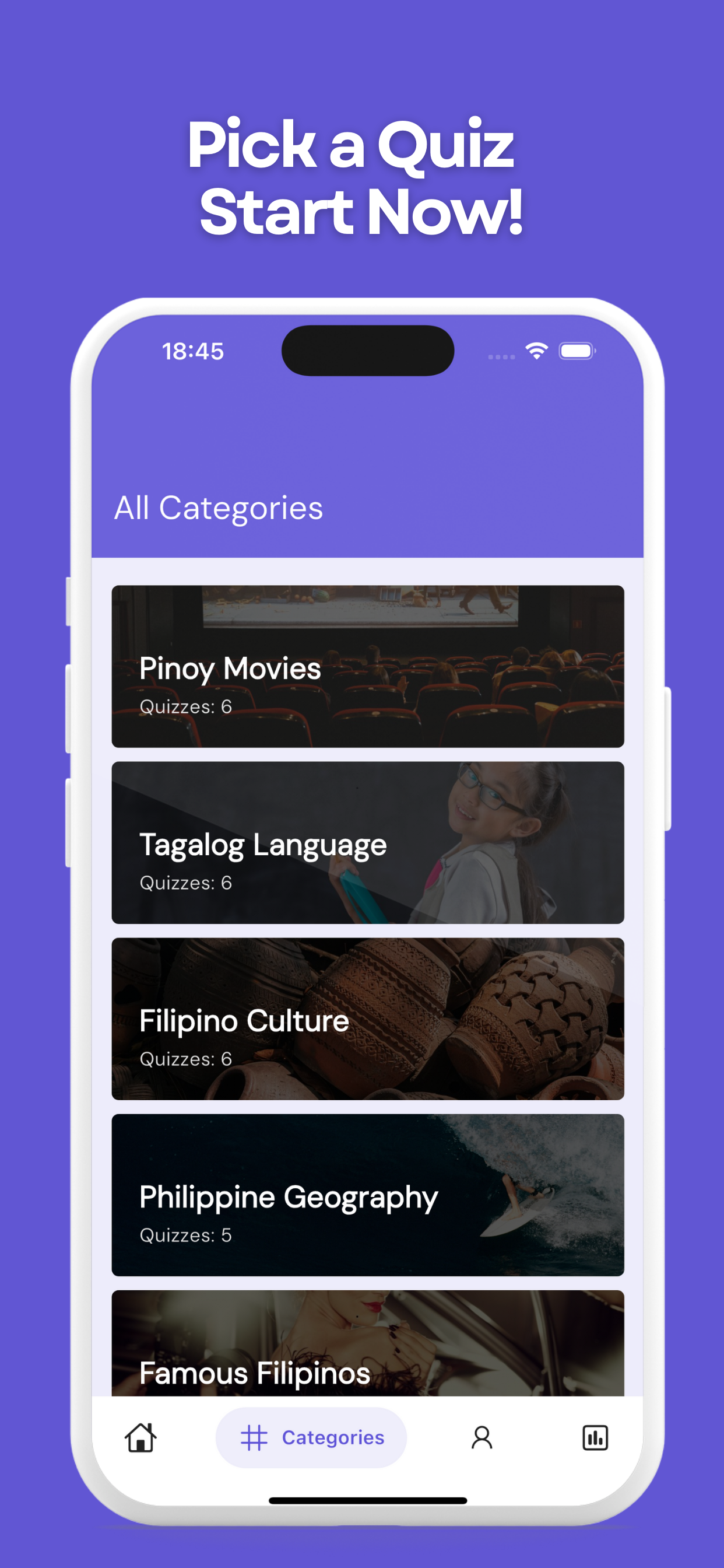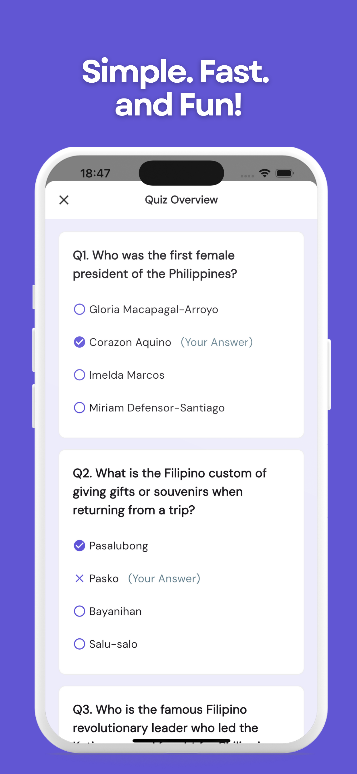 Are you a true Pinoy at heart? Do you love testing your knowledge about the Philippines, its culture, and its people? Look no further! Introducing Pinoy Quiz, the ultimate mobile app designed to challenge and entertain every Filipino and anyone passionate about the Philippines. Pinoy Quiz is more than just a game; it’s an engaging way to explore the rich tapestry of Philippine history, culture, and modern life. This app offers a comprehensive array of quizzes that cater to every interest and curiosity about the Philippines. Whether you're a history enthusiast, a pop culture fan, or someone who loves a good laugh, Pinoy Quiz has something for you. Explore a World of Quizzes: - We love Pinoy Movies. Filipino movies are best and filipino cinema is always going well. There are so many filipino actors and filipino actresses, people love them so much. Are you ready for quizzes about celebrities of the philippines! Filipino Movie tests and answers, pinoy movies questions, test your knowledge with this app. - Pinoy Quiz Tagalog: For those who prefer questions in Tagalog, this section offers a variety of topics in the national language, making it perfect for native speakers and learners alike. - Pinoy Celebrity Quiz Games: Are you up-to-date with the latest in Pinoy showbiz? Test your knowledge of Filipino celebrities and their lives. - Pinoy History Quiz: Dive deep into the past with questions about significant events and figures in Philippine history. Perfect for history buffs and students alike. - Funny Pinoy Quiz: Enjoy light-hearted fun with our collection of humorous and entertaining trivia questions. - Filipino Quiz and Answer: Learn while you play with detailed answers that provide more information about each topic. - Filipino Architects Quiz: Appreciate the genius of Filipino architects and their contributions to the world of architecture. - Philippine Art Quiz: Test your knowledge on the vibrant world of Philippine art and its most influential artists. - Pinoy Quiz Challenge: Compete against friends and family to see who knows the most about the Philippines. It’s a fun way to bond and learn together. - Philippine Culture Quiz: Explore the diverse cultural heritage of the Philippines with quizzes that cover traditions, festivals, and more. - Philippine Capital Quiz: How well do you know the capitals of the Philippine provinces? This quiz will test your geographical knowledge. - Philippine Cities Quiz: From Luzon to Mindanao, discover interesting facts about Philippine cities. - Pinoy Pop Culture Quiz: Stay on top of current trends and iconic moments in Filipino pop culture. - Philippine Environment Quiz: Learn about the natural wonders and environmental issues facing the Philippines today. - Philippine Economics Quiz: Gain insights into the economic landscape of the country with this educational quiz. - Philippine Heroes Quiz: Honor the great men and women who shaped the nation by testing your knowledge of Philippine heroes. Pinoy Quiz is designed to be user-friendly and engaging, with quizzes that are both fun and informative. Each question is an opportunity to learn something new about the Philippines, making it perfect for students, educators, and trivia lovers. Download Pinoy Quiz Today! Embark on a journey through the heart of the Philippines with Pinoy Quiz. It’s not just a game; it’s a celebration of everything that makes the Philippines unique. Whether you’re preparing for a quiz night, looking for a fun educational tool, or simply wanting to pass the time, Pinoy Quiz is your perfect companion. Get ready to challenge yourself, learn, and have a blast with Pinoy Quiz – the ultimate Filipino trivia experience! Download now and start exploring the wonders of the Philippines, one question at a time.