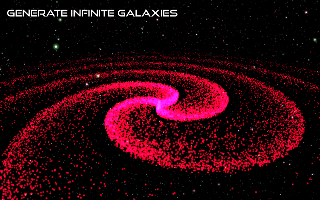 ◆ Milky Way Galaxy Generator. Procedurally generate galaxies which consists of millions of stars. View stunning randomised coloured spiral patterns. Travel and discover new experiences. View the entire milky way and its neighbouring galaxies.