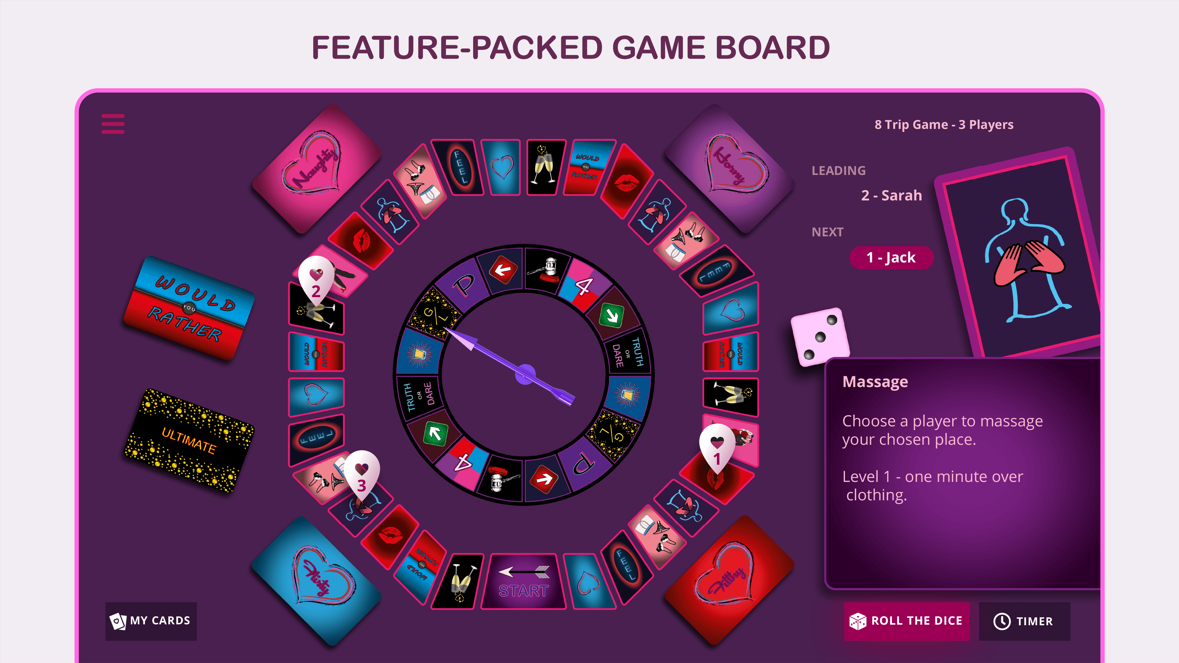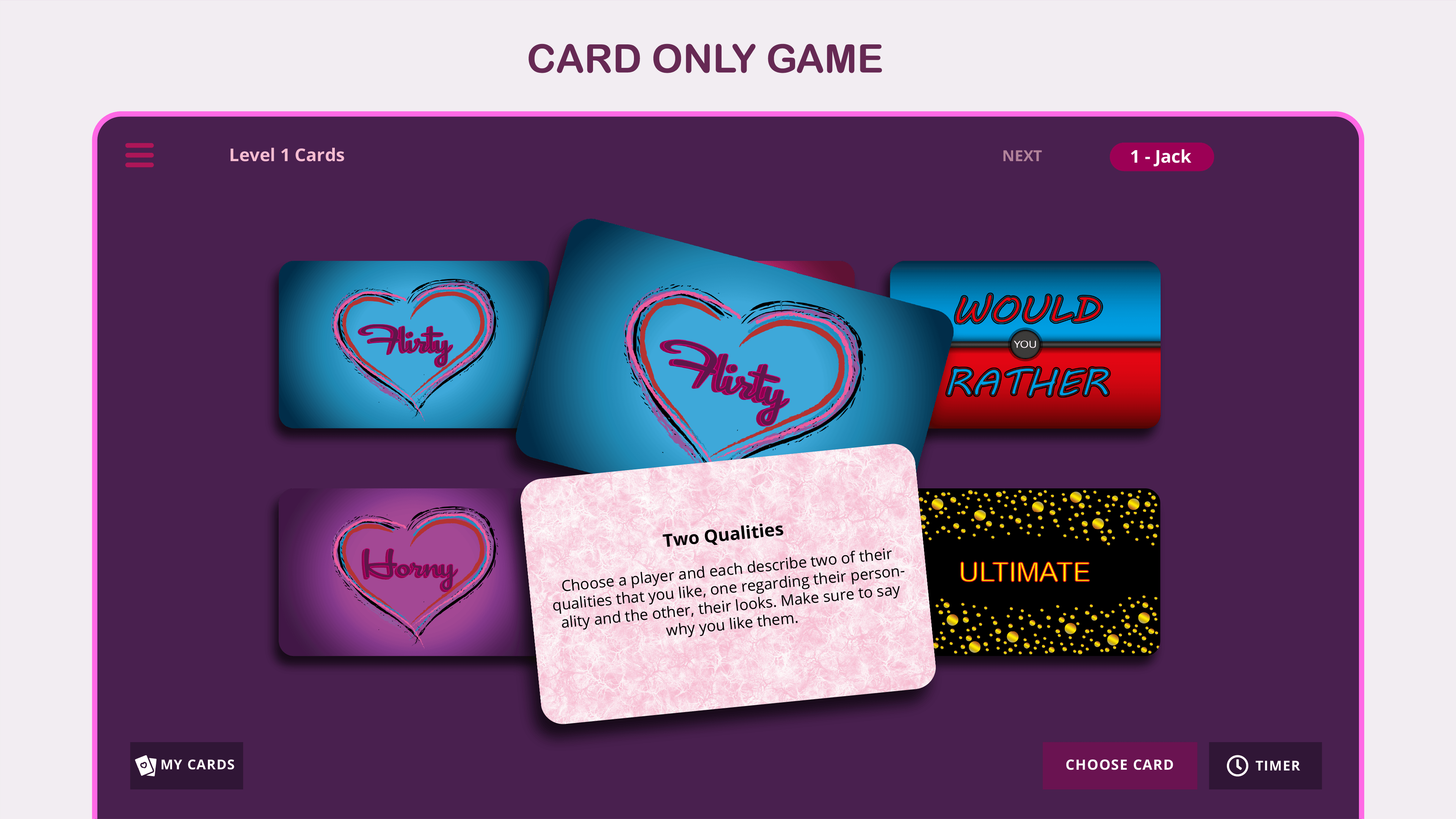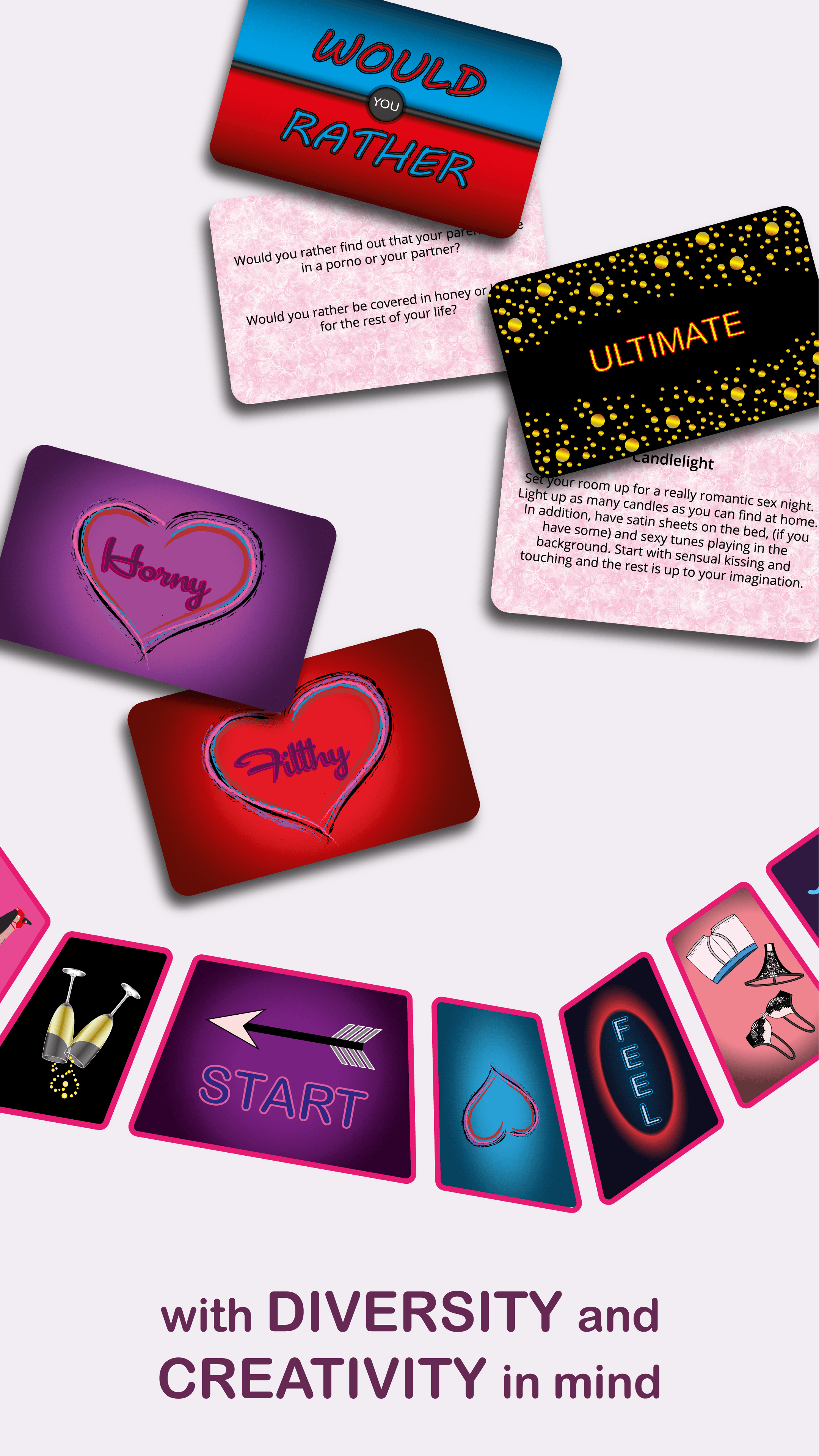 Feeling horny? Want a quick couple game? Skip the board game and jump straight into our card game and explore our popular Truth or Dare category. Ask Would You Rather adult question and learn more about other players. Share love messages and drinking dares. You be sure to find a new fetish here. Ultimate is our main card category with spicy fantasies. Also, plenty of expansion packs like the Multiquest, Sex Fact, Never Have I Ever and more released frequently.