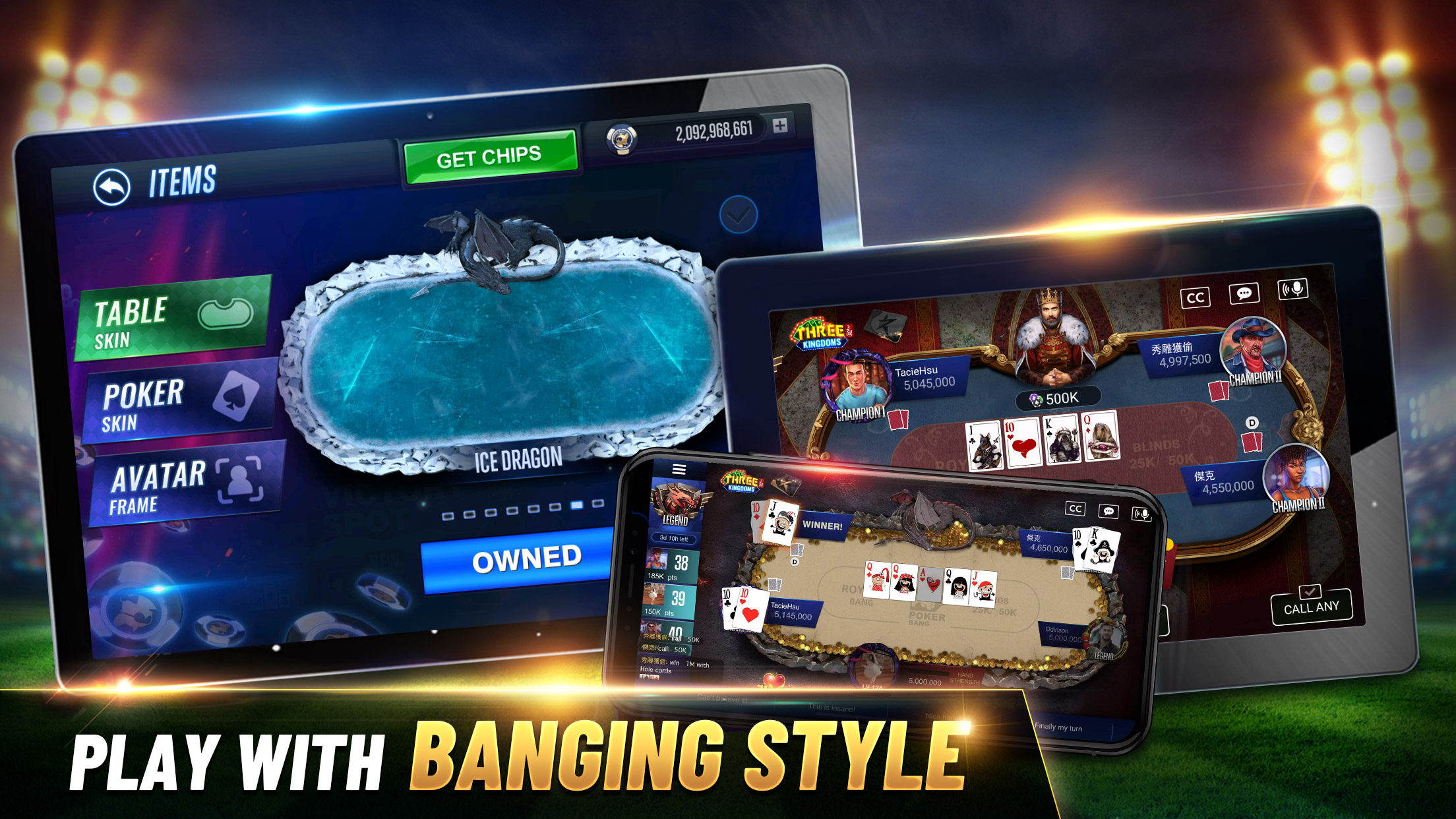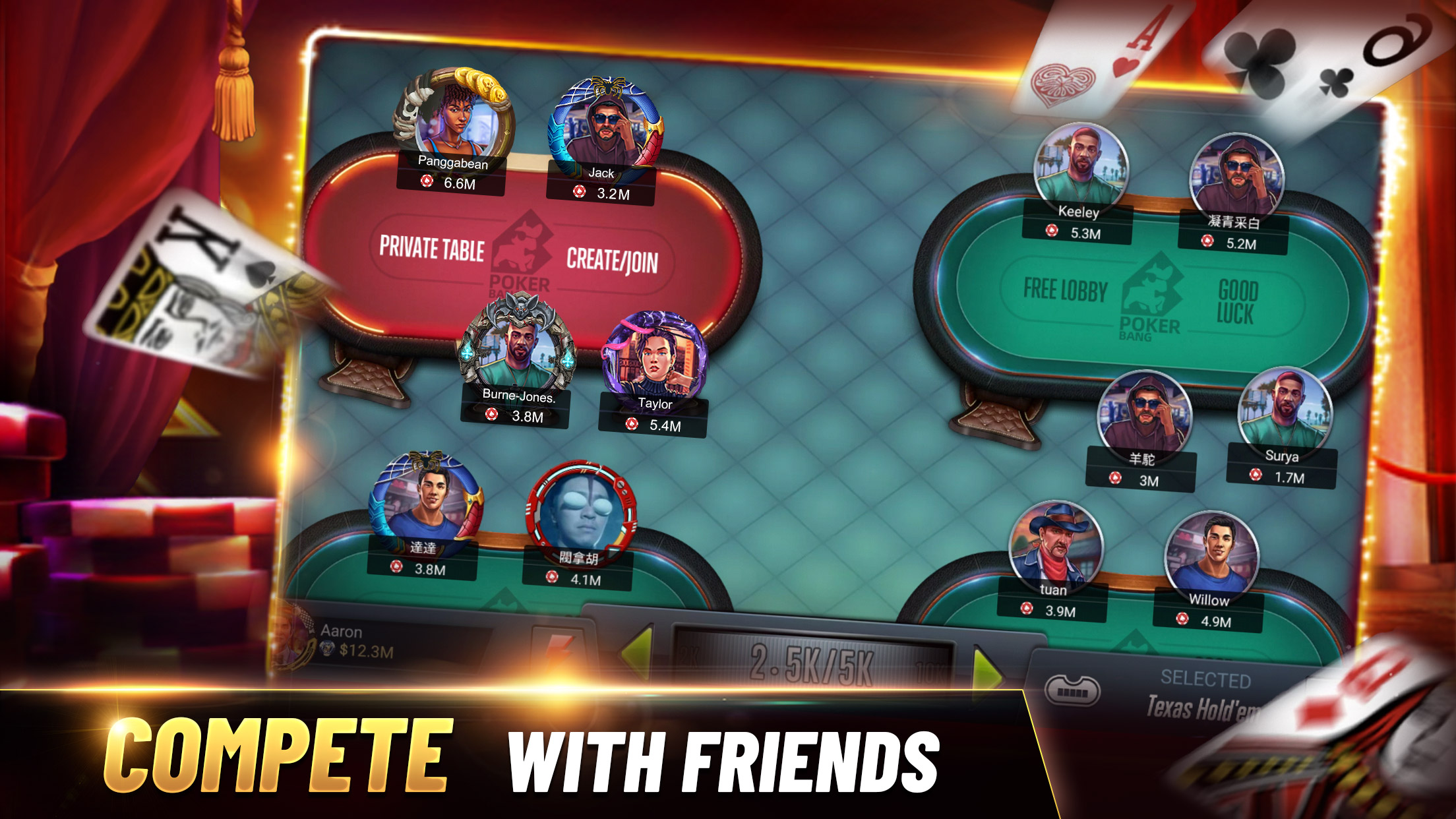 Want to show off your unique personality? Upload a photo to create your own custom avatar, and choose from different themed avatar frames, table skins, and card skins to show off your unique “Poker Bang” style. Let Poker become an art!