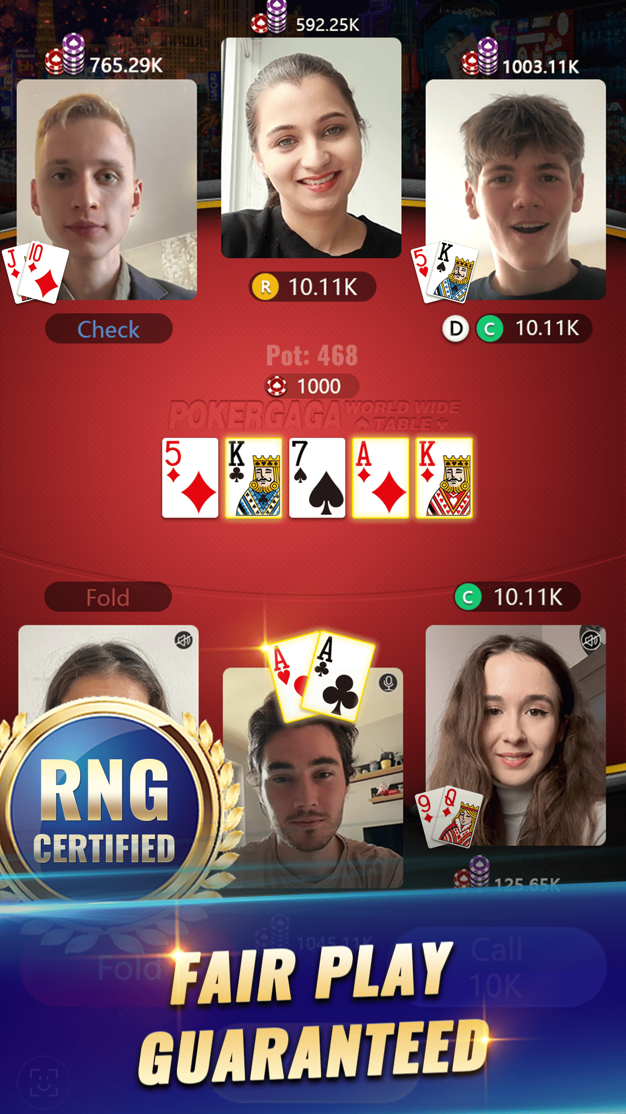 PokerGaga is a Multiplayer Video Chat Poker Game. Play Live Texas Hold'em Poker anytime, no matter where you are. Have a real poker night without leaving your house. Download PokerGaga now, invite your friends and feel the heat of the game! ◉ SOCIAL POKER EXPERIENCE: Distance does not matter anymore, emerge yourself into the pool of fun and excitement! Challenge your friends to poker games, and meet new friends online. PokerGaga has the strongest community of any poker game around the world. ◉ WORLDWIDE: Meet new poker friends in poker table miles away from home and zoom yourself into the game! Playing and conversing with real people was never more fun than now. ◉ PRIVATE TABLES: Throw a poker house party for your bros or make new friends online. This game will enable you to have fun in real-time with your friends. Everything that you love poker for, is now at the tips of your fingers. ◉ SNG(SIT & GO): If you like to get more rewards in more exciting games, please sign up for our SNG! Become a big winner in face-to-face poker games that are open every day for a limited time. MAIN FEATURES: Group Video Chat Texas Holdem Poker - Real-time video chat Poker with your friends live 24/7 for free! Gifts and Items - In all poker games, PokerGaga has the most kinds of gifts and items! - In these constantly updated treasures, you can always find the one you like. - In addition, you can also sell gifts in exchange for points! Rankings - Whether you are a Texas Holdem master or a novice, you can compete with players from all over the world on the PokerGaga rankings! Lucky Bonus - Spin the wheel, try your luck, and win a bunch of points! Album Collection - All players have a chance to obtain card packs of different levels while playing; after collecting a full card album, the player can earn good rewards (free coins, limited-time outfits, and permanent outfits). Fair Play - Your luck and good strategies are all you need to win here! - PokerGaga has the exclusive RNG Certificate issued by Gaming Labs that guarantees the deal of cards is totally random. Come on! Join the Most Authentic and Popular Free Poker App in the world! Look in your opponent’s eyes! Show the world that the real poker pro is in the house. Bring your friends together, play, have fun, and get that real poker game feel. We'd Love to Hear Your Feedback! Connect with us on Facebook ( https://www.facebook.com/joinpokergaga ). * PokerGaga contains in-app purchases. * PokerGaga is intended for an adult audience for amusement purposes only and does not offer 'real money' gambling or an opportunity to win real money or prizes. * Practice or success at a social poker casino gaming does not imply future success at 'real money' gambling. Privacy Policy: https://pokergaga.net/userPrivacy/ Terms of Service: https://pokergaga.net/userTerms/