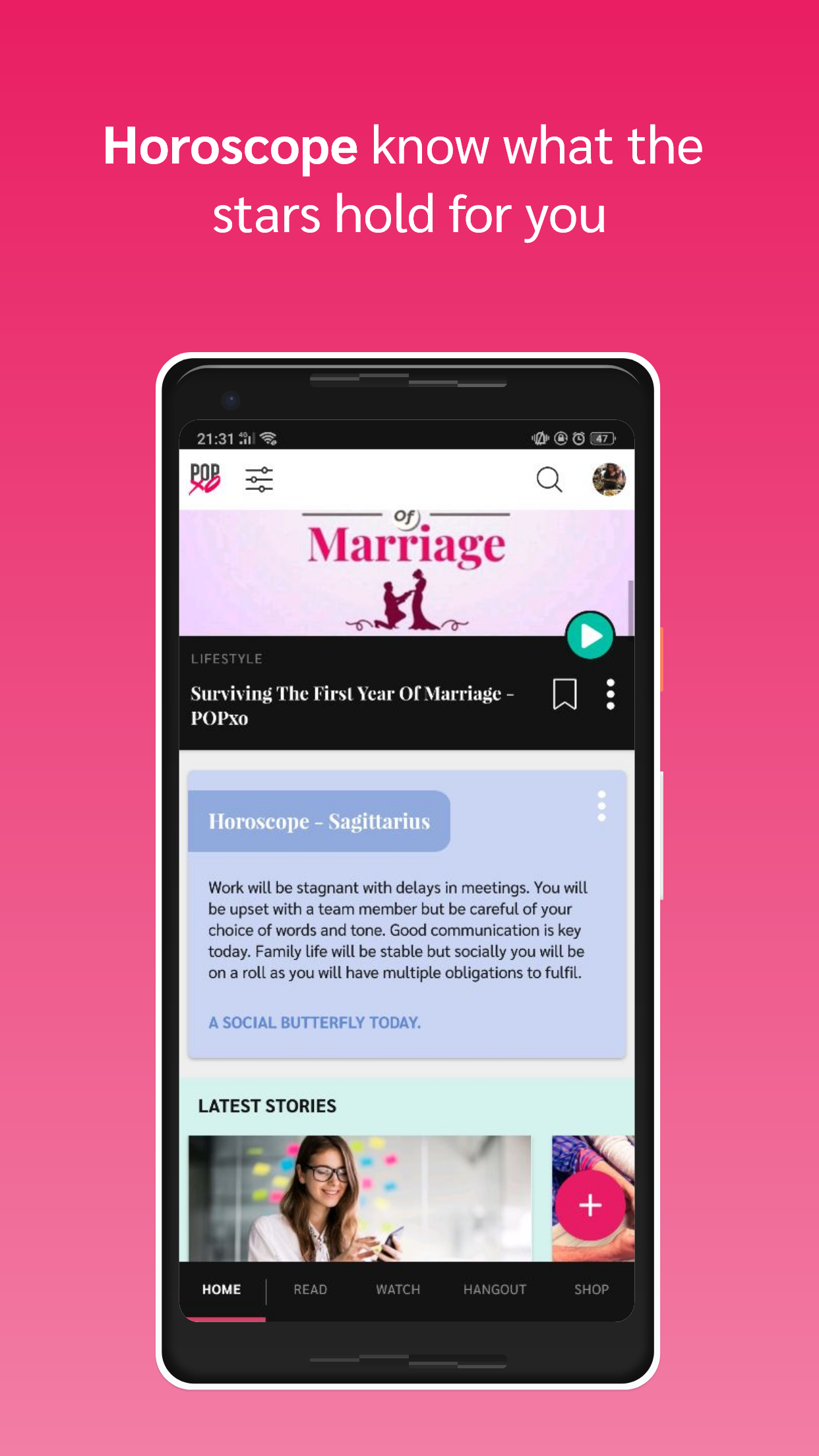 With more than 25 million users and growing, POPxo is India's largest and most vibrant community of women and is now available in six languages. A fun place where you can connect with like-minded women, ask questions, read articles, watch entertaining videos, and shop for super cool and quirky products. POPxo is your one-stop-shop for everything you need to know from the world of beauty, fashion, wellness, lifestyle, wedding and entertainment. With POPxo on your fingertips you’ll never be alone with so much happening in the app. Things to do on POPxo Read: Our editorial team works round the clock to bring you the latest from the world of fashion, beauty, wellness and entertainment by publishing 1500 articles every month. With wellness and entertainment as two new verticals, POPxo deep dives in issues that touch a woman's life in every step of the way. Watch: We create more than 50 videos every month on beauty and fashion. Get entertained by watching POPxo’s funny and super relatable videos made your entertainment. You can even pick up a trick or two from the many fashion and beauty videos made for women just like you. Shop: Choose from the latest collection of POPxo Shop’s quirky line of bags, stationary, passport covers and much more. Our products make perfect and sassy gifts for your bestie and even you! Online Community: Connect with India’s largest women-only community. Ask a question or create a poll. Help others by answering their queries. Share your talents, life hacks or just give simple advice to women like you. With Hangout going app-exclusive, it will be more fun and safe. Ask Questions: Share your thoughts, concerns, experiences in Hangout. Use our ‘anonymous’ feature and feel free to ask or share your problems or doubts to get your answers. Create Polls: Ever stuck in a dilemma and need a quick answer, create a poll and let others help you decide. Read your horoscope: Start your day by knowing what the stars have in store for you. Period Tracker: Our cheeky period tracker Gulabo tracks your period and gives you useful menstrual health tips to ease the pain. Choose your language: Customise POPxo app by choosing your preferred language. We are available in English, हिंदी, বাংলা, தமிழ், తెలుగు and मराठी.