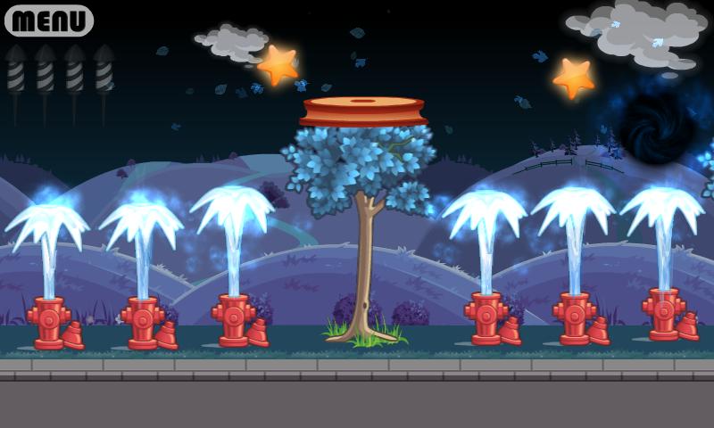 Throw boxes over houses and trees, collect rockets to jump high, use trampolines and rainy clouds,