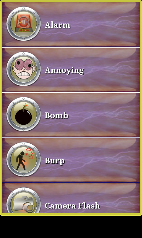 funny prank sounds effects Including send prank sounds to friend or to ringtones or turn on timer to the prank sounds. Including sounds of window break, winchester, whip, shaver, scary sound, annoying sound, alarm, fart, burp, electric sound, funny haircut, mosquito sound, funny laugh, funny donkey, camera flash, bomb exploding sound. prank sounds effects and ringtones to drive your friends crazy this is an funny application to create funny prank sounds and hilarious prank sounds situations, you can turn the timer on the prank sounds to joke with friends. Including: ★ play prank sounds. ★ share prank sounds ★ set to ringtones ★ turn on timer to the prank sounds Enjoy with the funny application prank sounds effects and ringtones.