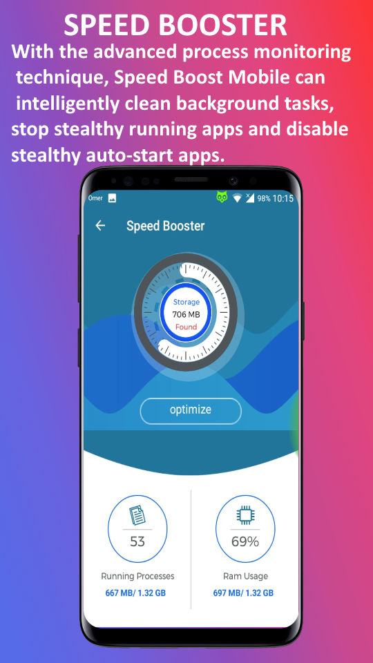 ⚡Speed Booster: With the advanced process monitoring technique, Speed Boost Mobile can intelligently clean background tasks, stop stealthy running apps and disable stealthy auto-start apps.