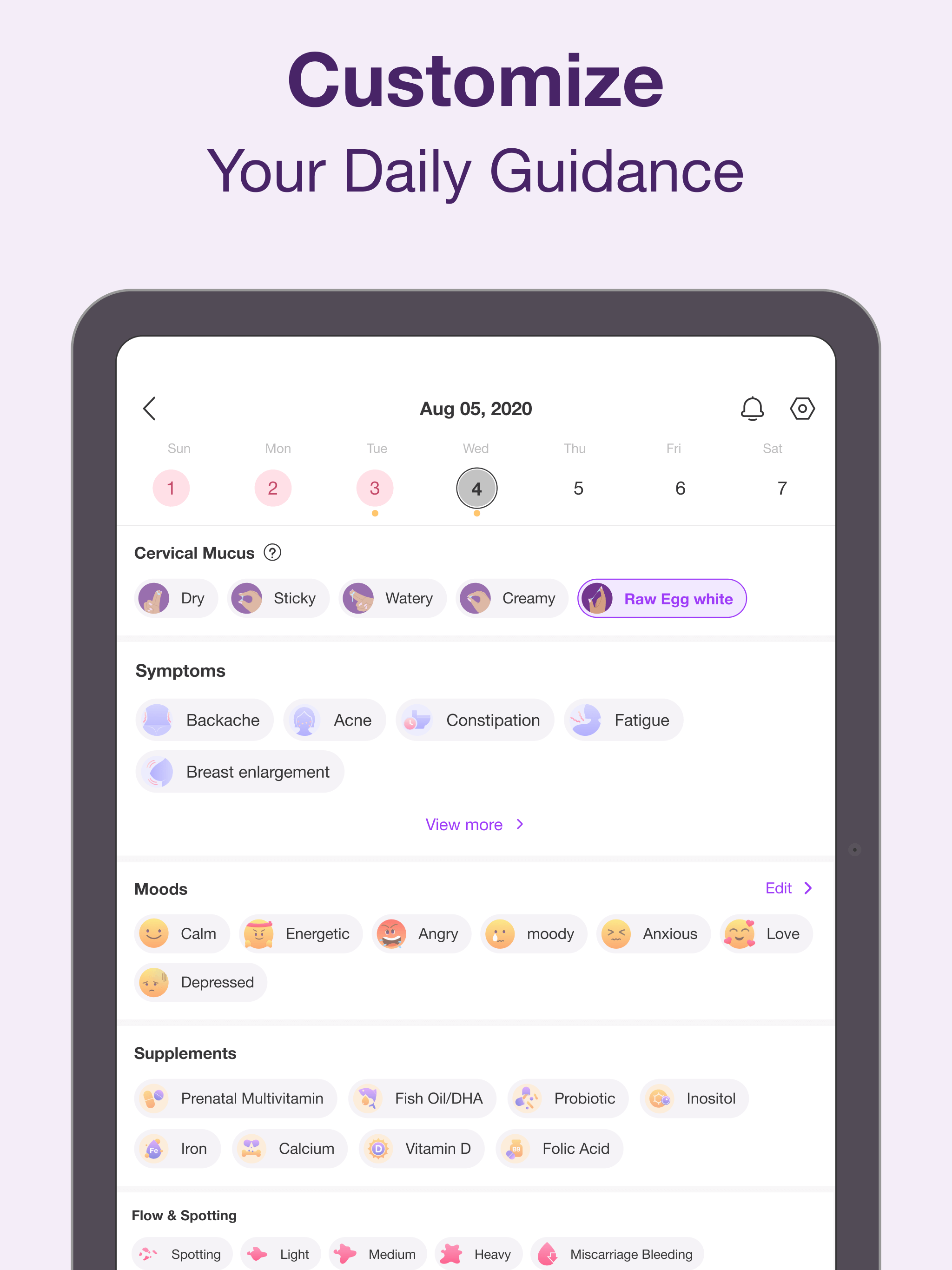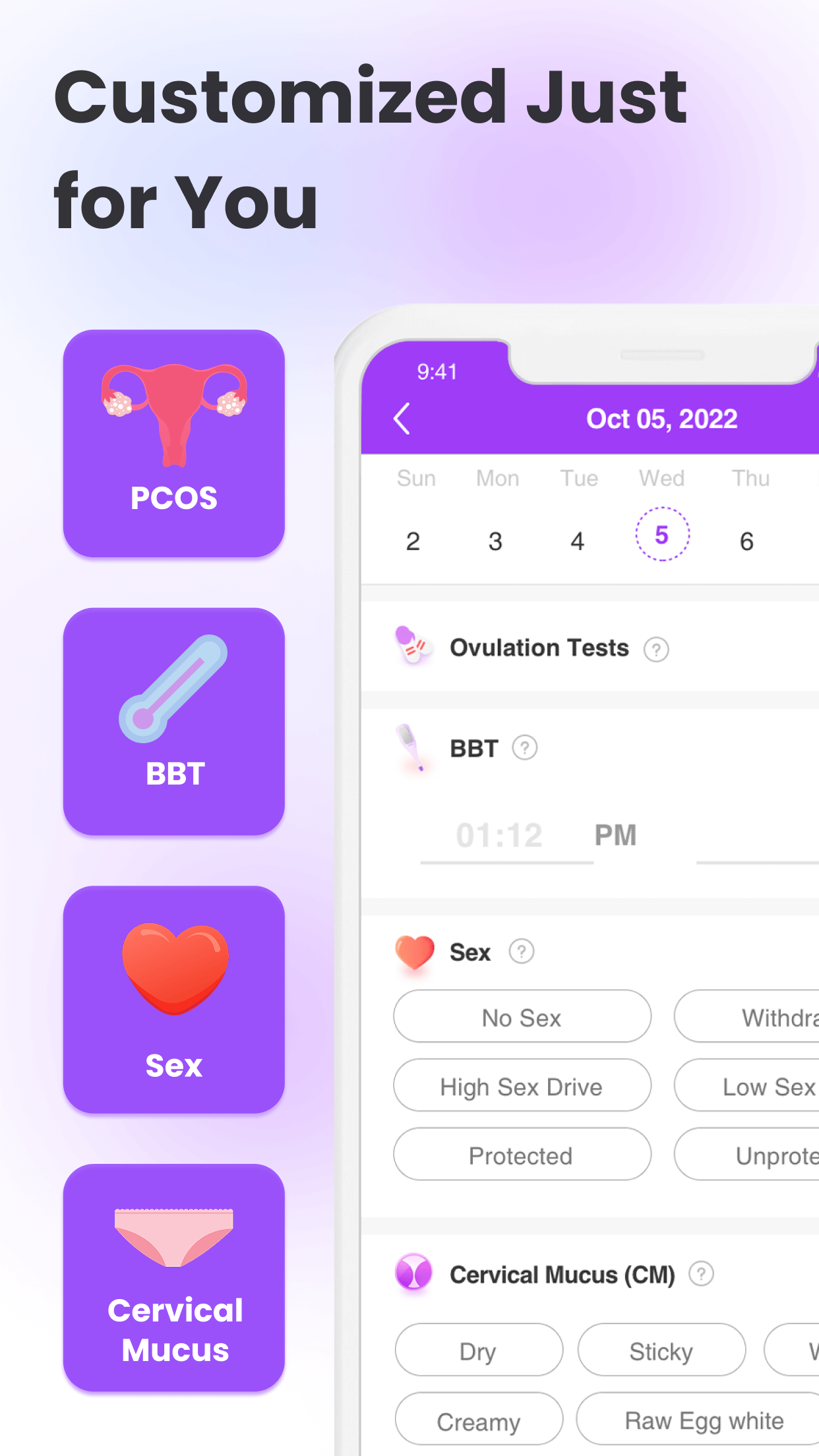 + Cycle & Ovulation Calendar: Track period flow, spotting, fertile window, discharge, sexual activity all in one place.