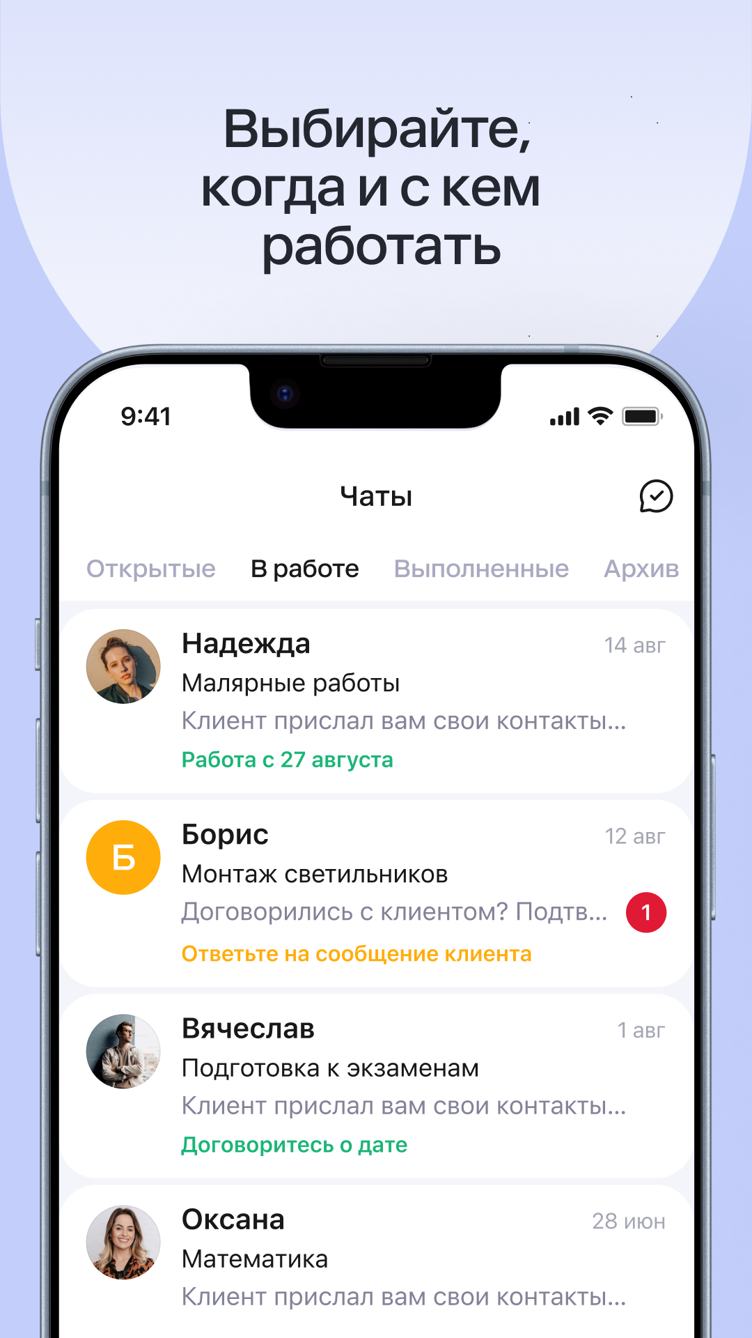 We help private craftsmen and companies find clients and earn money. With the help of the “For the Pros” application, they find orders and receive additional income for already 2,300,000 craftsmen and performers. We can find work and part-time work in Moscow, St. Petersburg and other cities. There are jobs for students. We are open to self-employed professionals and companies. The application is suitable for job search and part-time work for students. More than 20,000 orders appear daily on Pro. There are orders for tutors (including preparation for the exam), repairmen, plumbers, beauty masters, IT freelancers, instructors, lawyers, cleaners, couriers, cargo carriers, eyelash and manicure masters. With Profi it is easy to find a job and a part-time job in St. Petersburg and Moscow. We have 900 specialties. There is work for popular specialties - for example, an electrician, a tutor, a manicurist. There is a case for everyone, there is work and part-time work for students. You can fulfill orders in several specialties at once, take remote work or work at home. The budget and complexity of orders are different. For example, customers are willing to pay an average of 1,500 rubles to an electrician for an hour to install an outlet. You can offer your prices and look for jobs for money that you think is fair. The schedule is up to you. You decide whether the Pro will be a full-time job or a part-time job. How to make money with Pros - Install the application and start looking for work - suitable orders. - If the client has chosen you, complete the task for money. Receive payment from the client. How it works You decide the format of work yourself: "Pro" can be an additional income - a part-time job in your spare time or the main source of income. You can choose to work remotely or work from home. Income is entirely up to you. You are a self-employed and self-employed specialist. You choose how much to work. Complete tasks for money and get paid directly from the client. The more you work, the more you earn. Only interesting orders can be selected. You decide which order to respond to. You can find a job near your home or work from home. The service is paid. Depending on the specialty, you pay for a response - sending your offer to a client, or a commission for a completed order. You can communicate with the client directly In orders there is a chat with the client. To find a job and get an order, you need to interest the client, agree on working conditions. Masters have a rating Clients evaluate the work of masters. The higher the scores, the more often customers will choose you. You don't have to spend a lot of time looking for a job. For example, a husband for an hour with a rating of 5+ receives approximately every 3-5 orders that he responds to. Who can become a master? Anyone who is ready to work and help clients. It is enough to register on the site. Does the master receive every order he responds to? Not necessary. Several masters can respond to one order. The client chooses the right one. Beginners need to send an average of 10 responses to find a job. How can a beginner get orders? Clients pay attention to the questionnaire. Fill in all the fields. If you are looking for a job near your home, indicate the areas you need. Choose a specialty, describe the conditions. For example: "Husband for an hour, work on weekends." Add photos of works, services and prices. What should I do if there is no Pro in my city? You can take remote work from us, look for a part-time job in St. Petersburg or a part-time job in Moscow. So, for example, often do teachers from the regions. They work with students via Skype. The application works on the territory of Russia, Kazakhstan and Belarus.