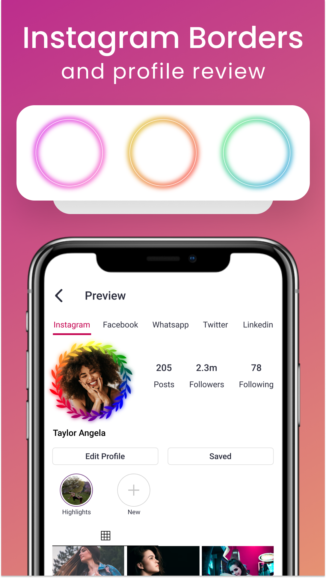 Preview & Save: You can create a stunning social profile easily. You just need to select a photo frame between a variety of borders, add your profile picture, and press the save button.