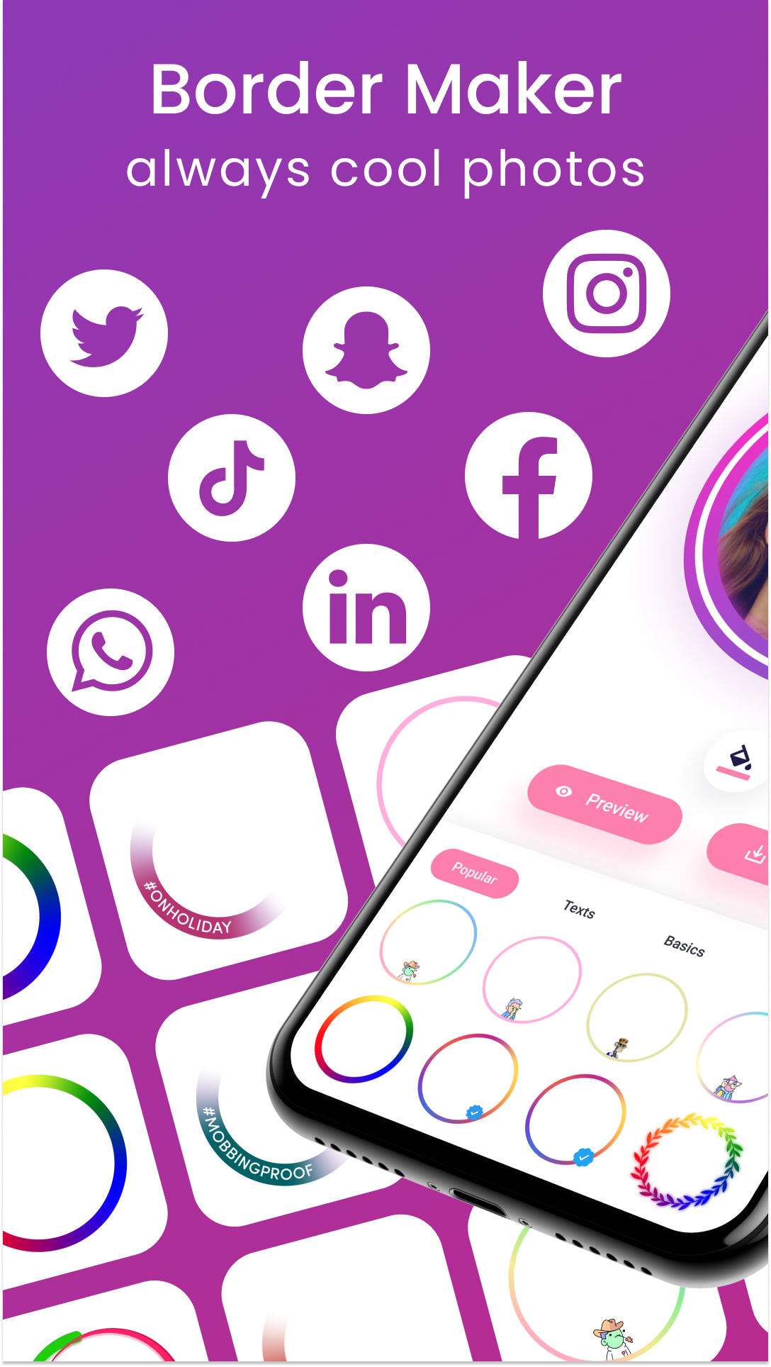 Profile Picture - Border Maker is an app which gives a perfect look to your social media profiles such as social media accounts. It contains a large collection of border frames with unique and creative designs. Besides, you can preview and add creative profile borders on your selfies or profile photos.