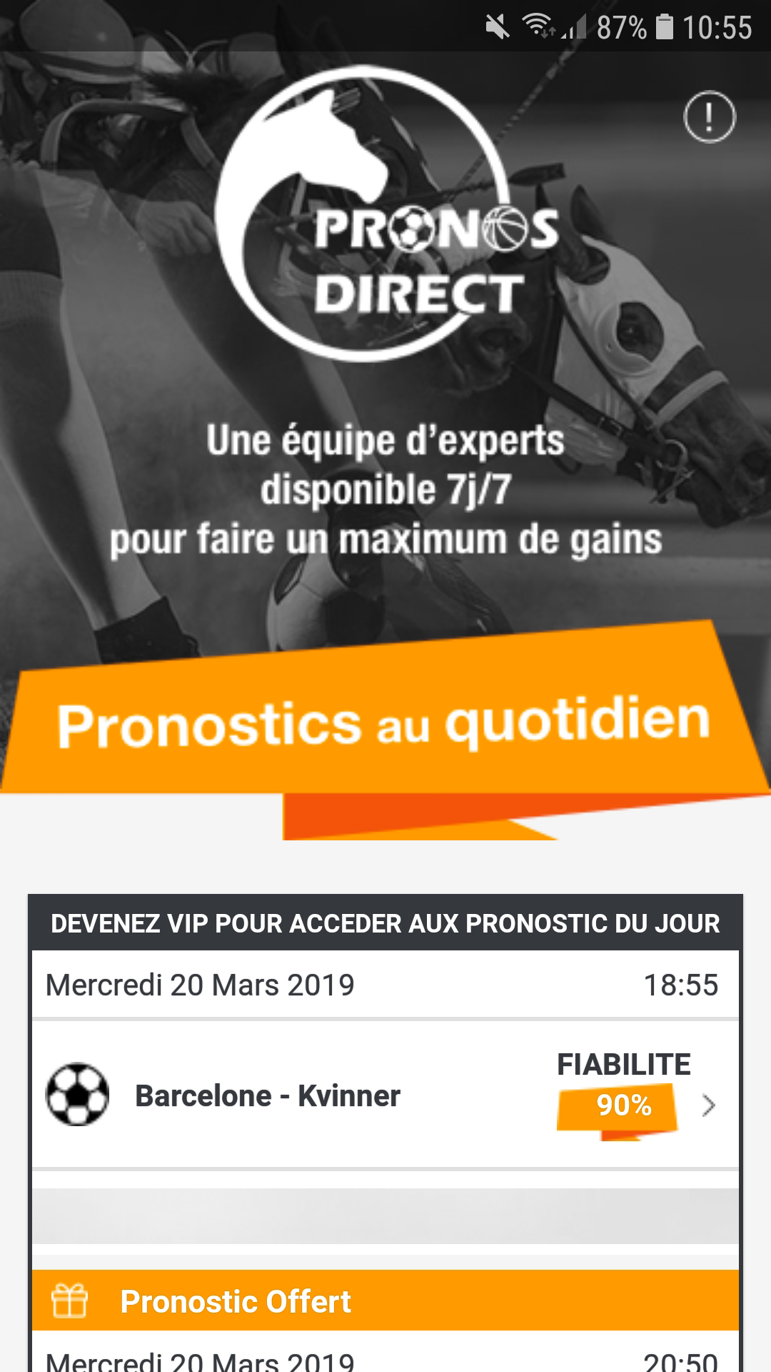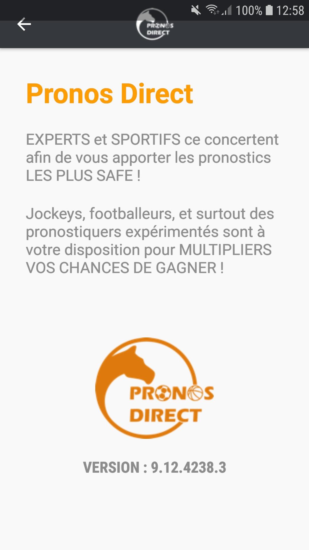 PronosDirect (Package Name: com.pronodirects) is developed by Pronos Direct and the latest version of Pronos Direct 2.0 was updated on March 12, 2020. Pronos Direct is in the category of Sports. You can check all apps from the developer of Pronos Direct. Currently this app is for free. This app can be downloaded on Android 4.1+ on APKFab or Google Play. All APK/XAPK files on APKFab.com are original and 100% safe with fast download.